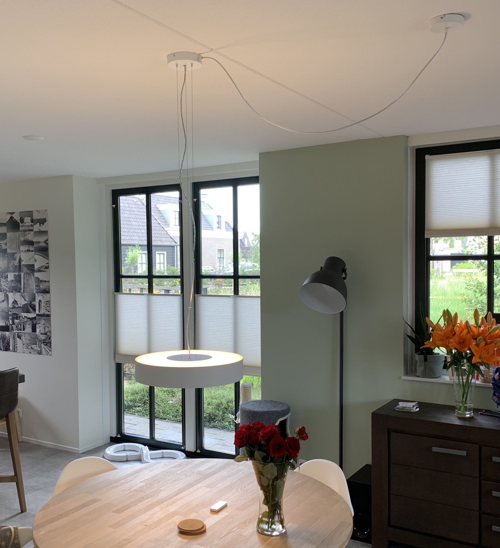 Edit: inmiddels ook de pulsschakelaar opgehangen en nu werkt hij nog beter. Bij eenmalig indrukken gaat de lamp direct aan/uit, waarbij de oude stand wordt bewaard. Bij het inhouden wordt de lamp gedimd / feller.