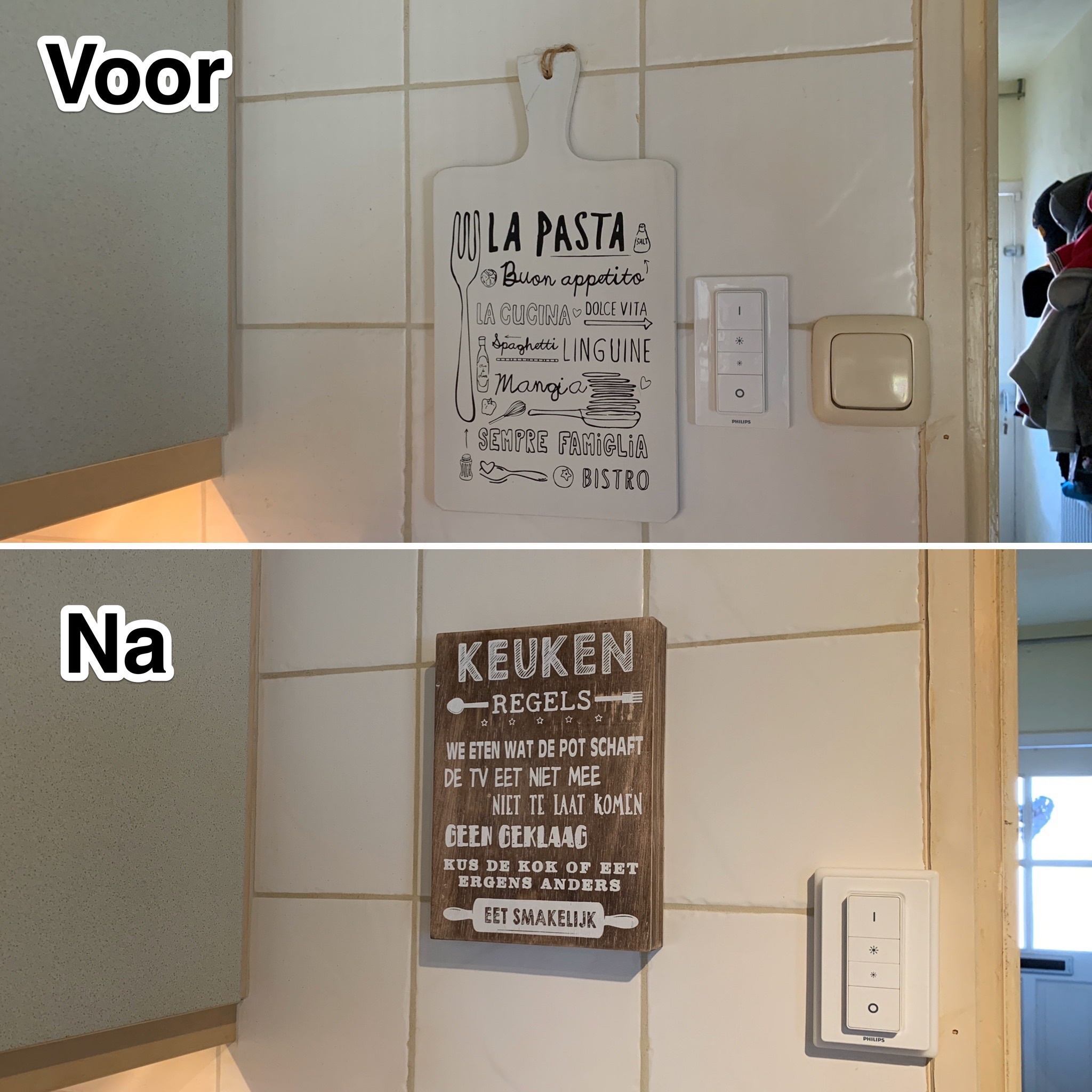 Moet alleen eens een keer gaan labelen voor de kinder oppasDoordat je niet gebonden bent aan aan-uit hebben de knoppen niet altijd het verwachtte effect. Zo heb ik in de woonkamer bv een Nacht stand (waarbij alle lampen beneden, een aantal lampen buiten en de Smartstekker bij de TV en de garagedeur uitgaan), die mensen die niet bekend zijn met mijn systeem natuurlijk niet verwachten