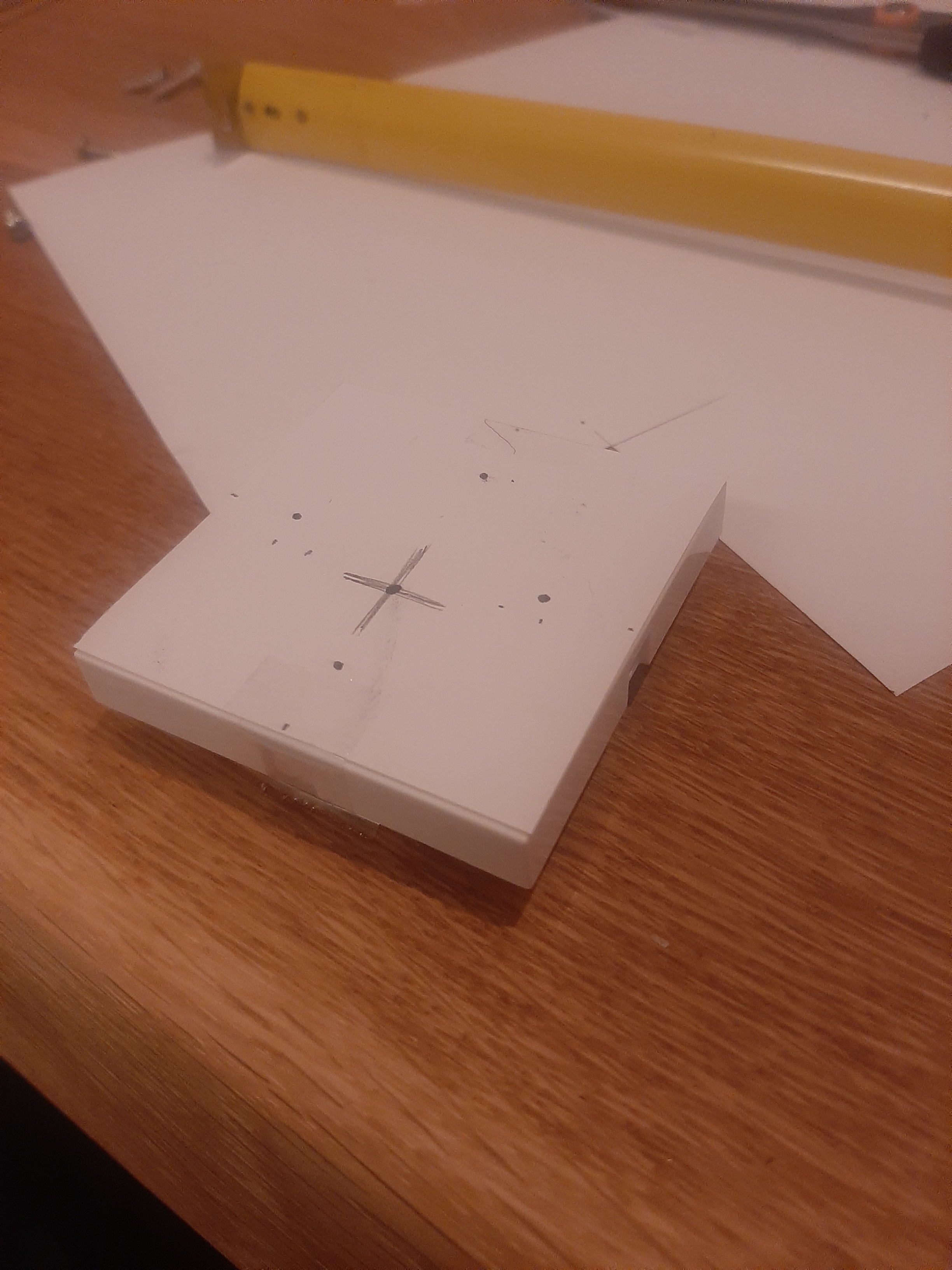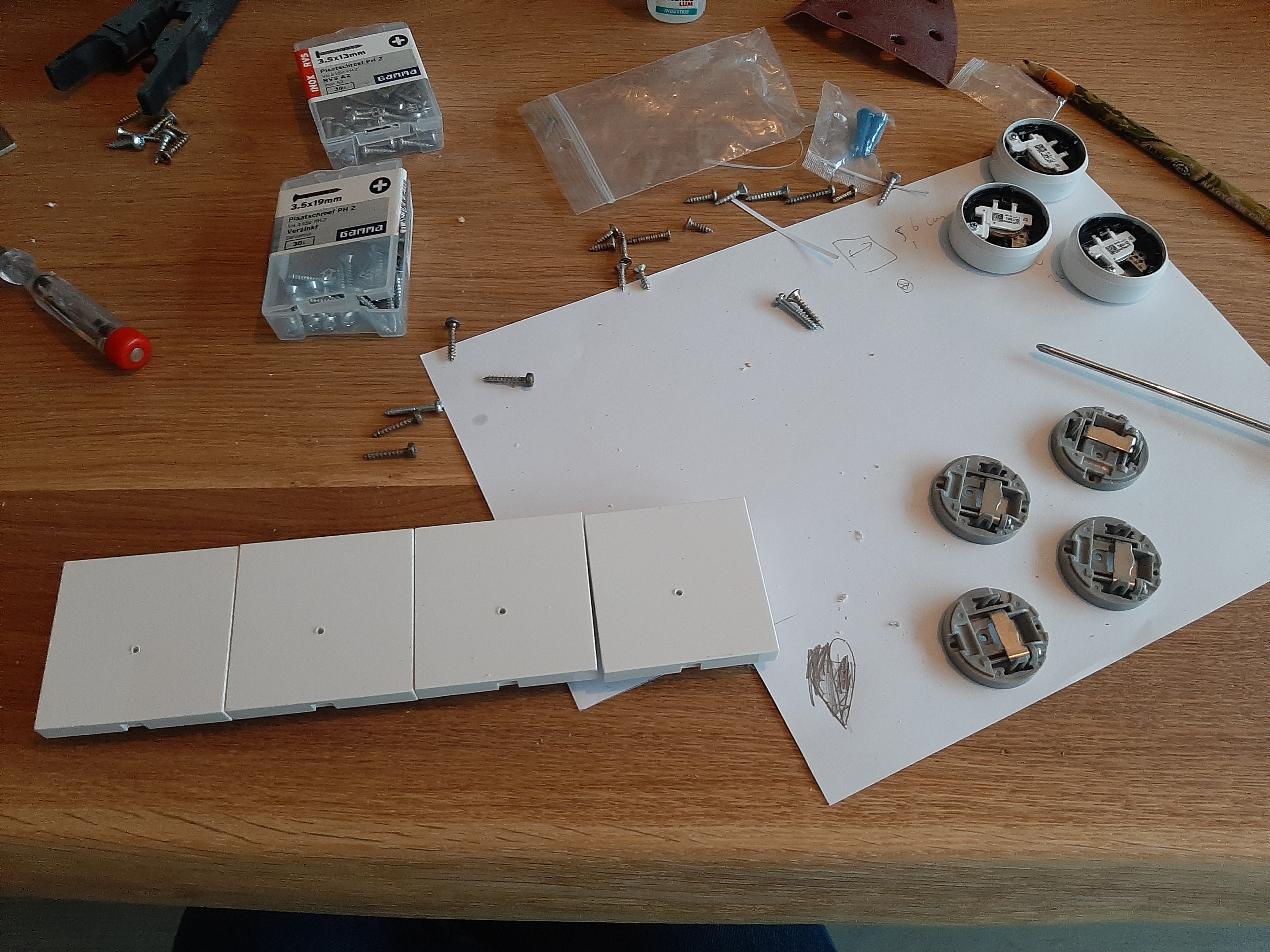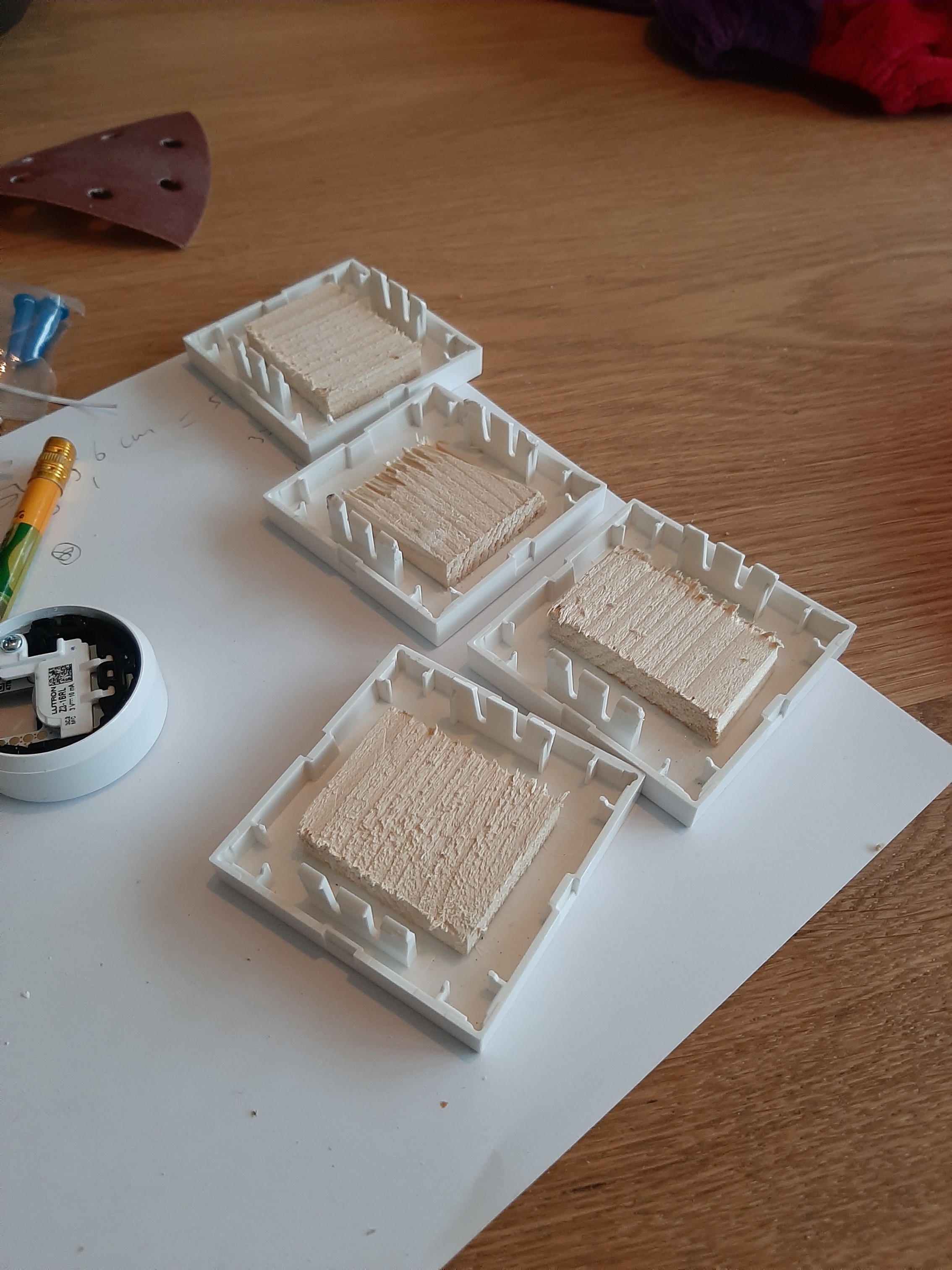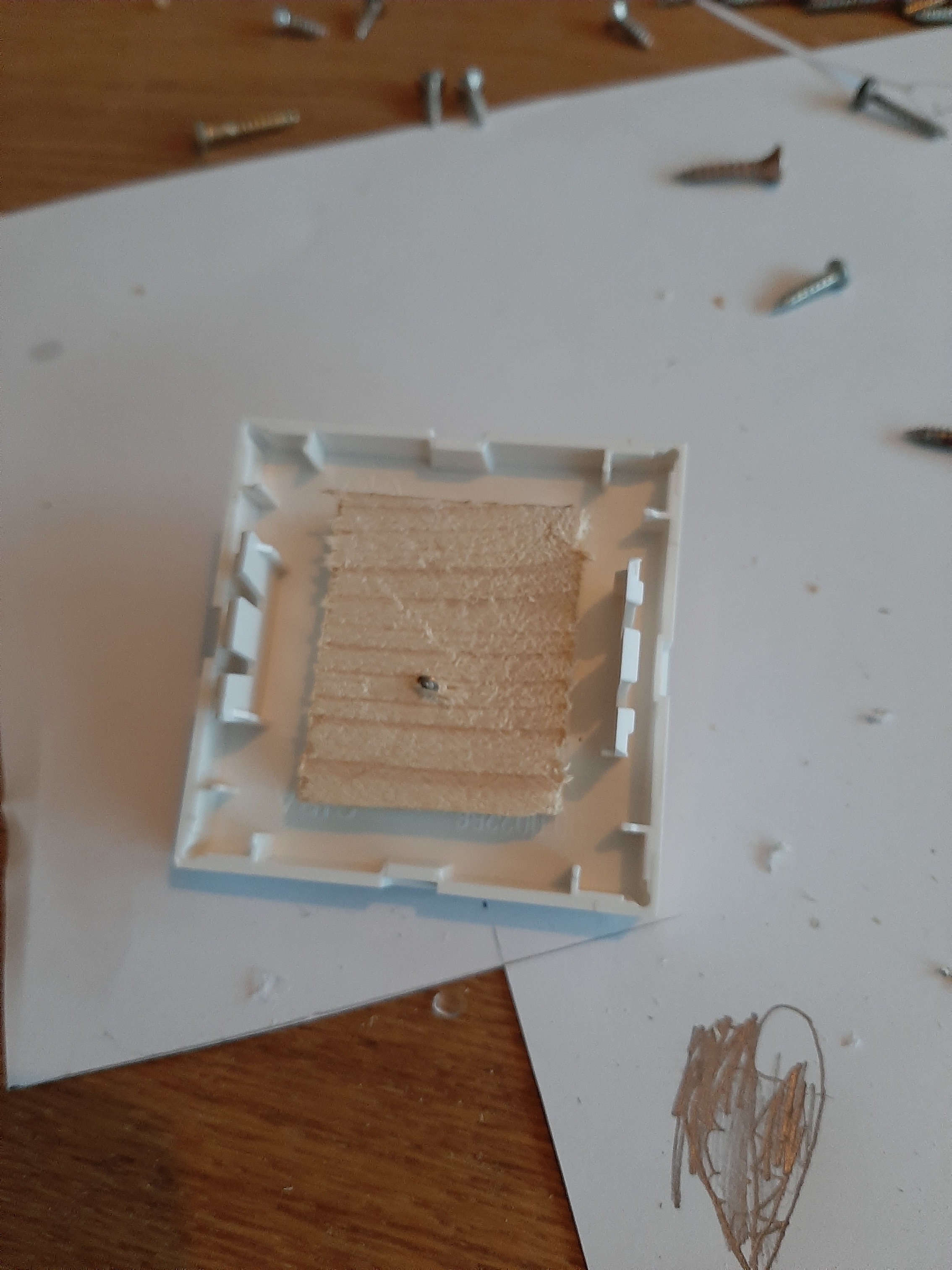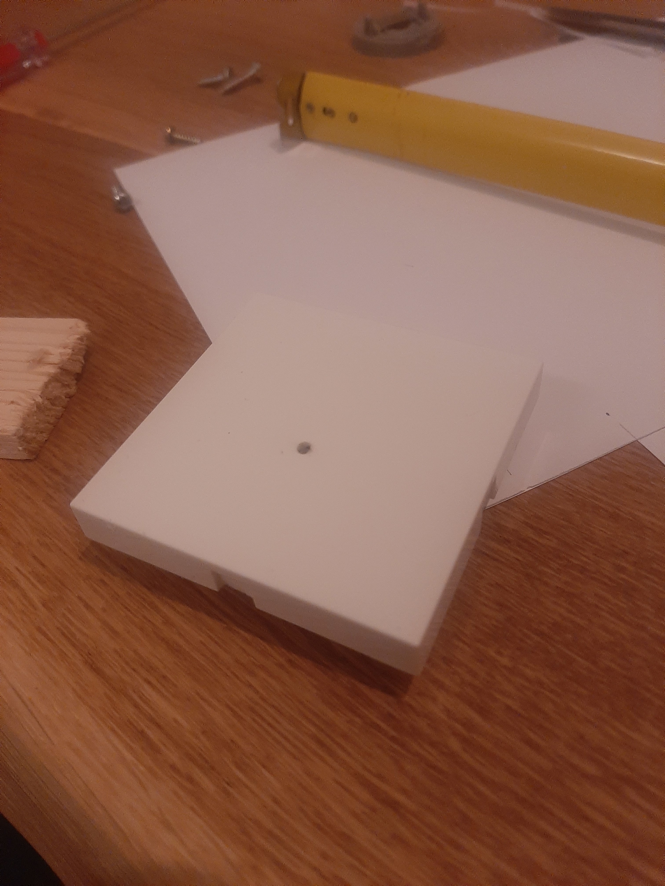 Intussen heb ik met een enkele plastieken sokkel een proefproject opgestart. om te kijken of het een mogelijke oplossing kan zijn voor de andere Niko Hue schakelaars. De boel moet nu nog wel een nachtje drogen en kan nadien verder afgewerkt worden of het al of niet iets zal worden.