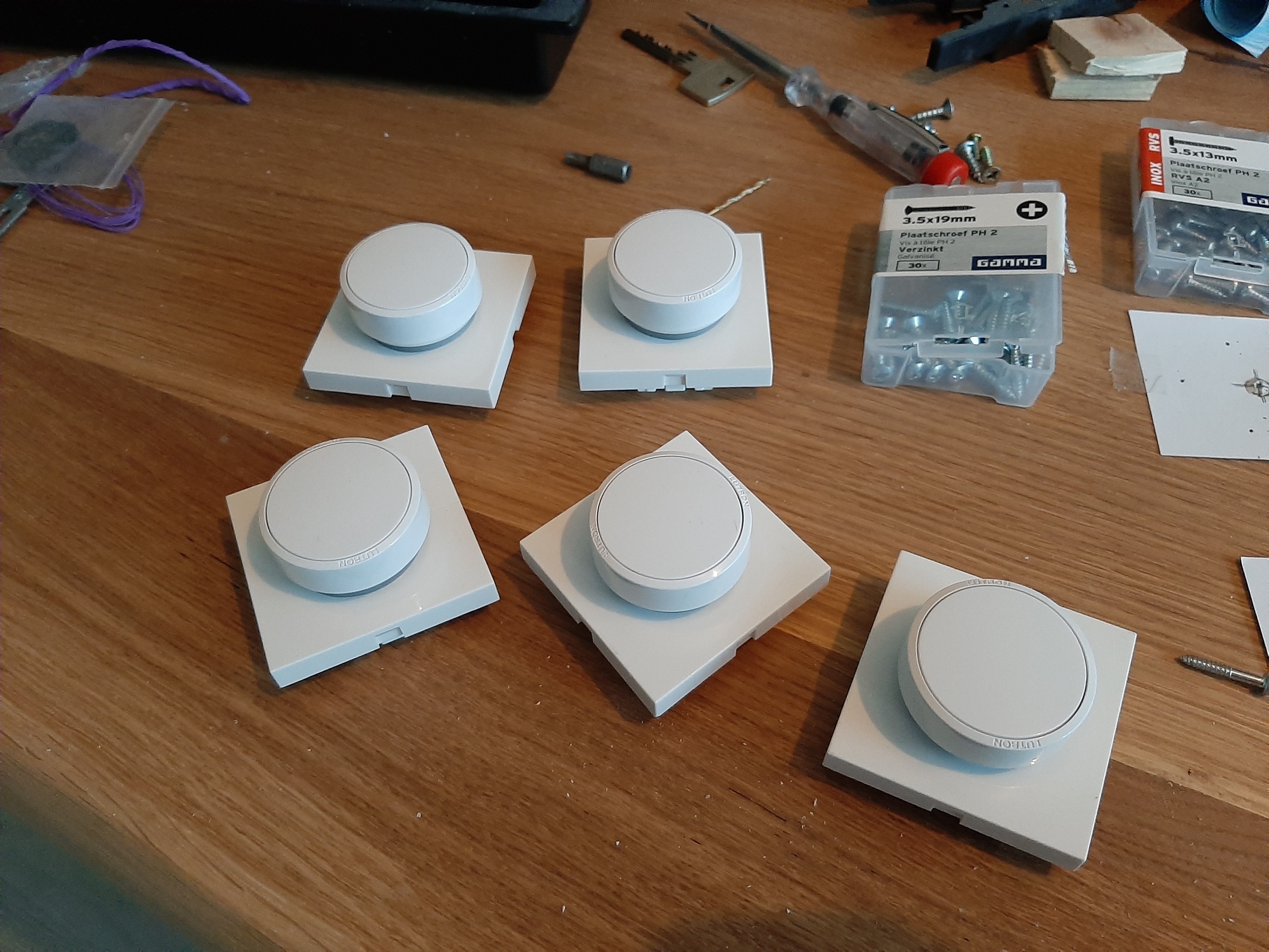 Maar ik moet toch een 11 tal schakelaars vervangen. Allemaal zijn het dubbele of zelfs 3 voudige schakelaars waarvan er enkele zelfs gesplitst zijn per 2. Ander probleem is dat enkele ervan ook geen Hue verlichting is en ook niet direct zal krijgen omdat het voor de verlichting buiten is.