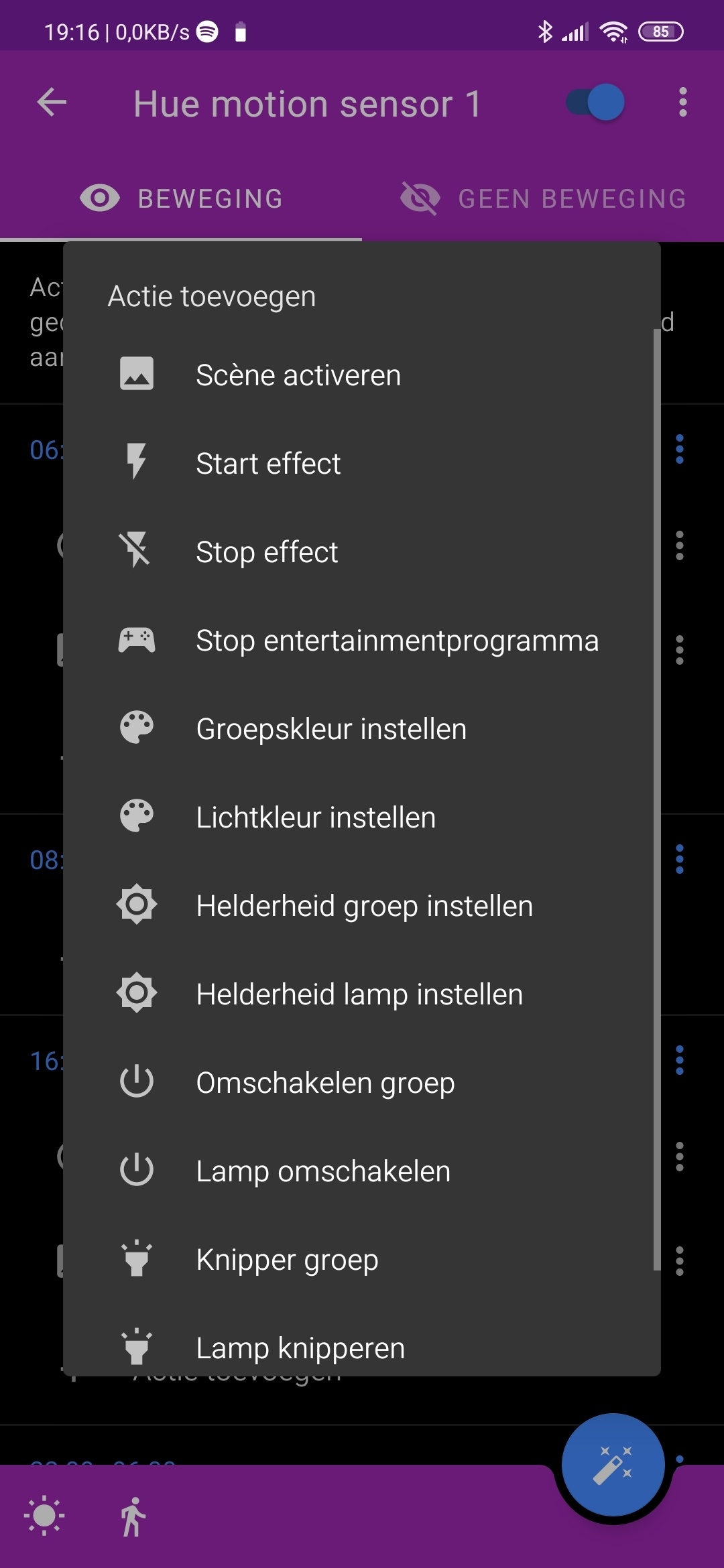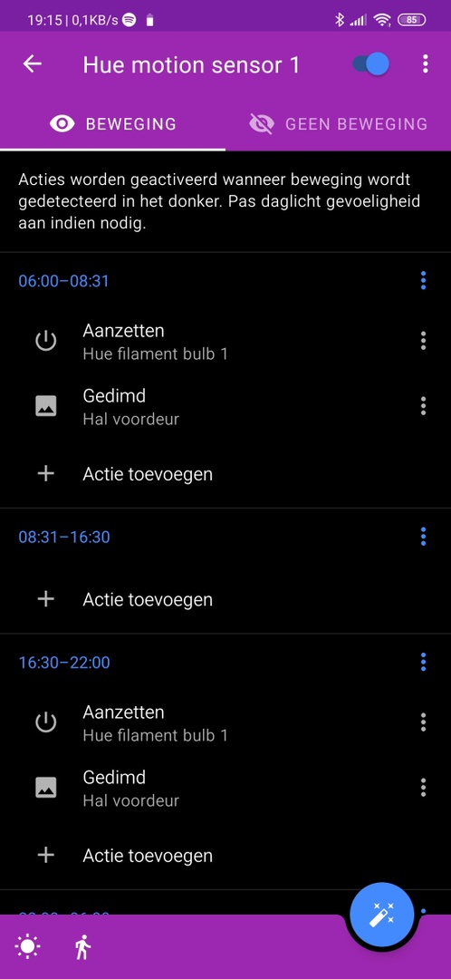 Ik gebruik ook de app Hue Essentials (android), daar kun je meer instellen voor de motion sensor, zie hieronder.Bert-Jan48 schreef op donderdag 2 januari 2020 @ 18:42: