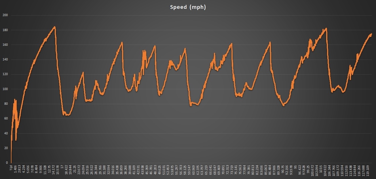 Ik heb deze verdeeld in 4 delen en steeds aan het einde van het deel de beste ronden, totaaltijd op dat moment, bandenslijtage en brandstofverbruik genoteerd. Overigens heb ik het niet 32 rondes overleefd.