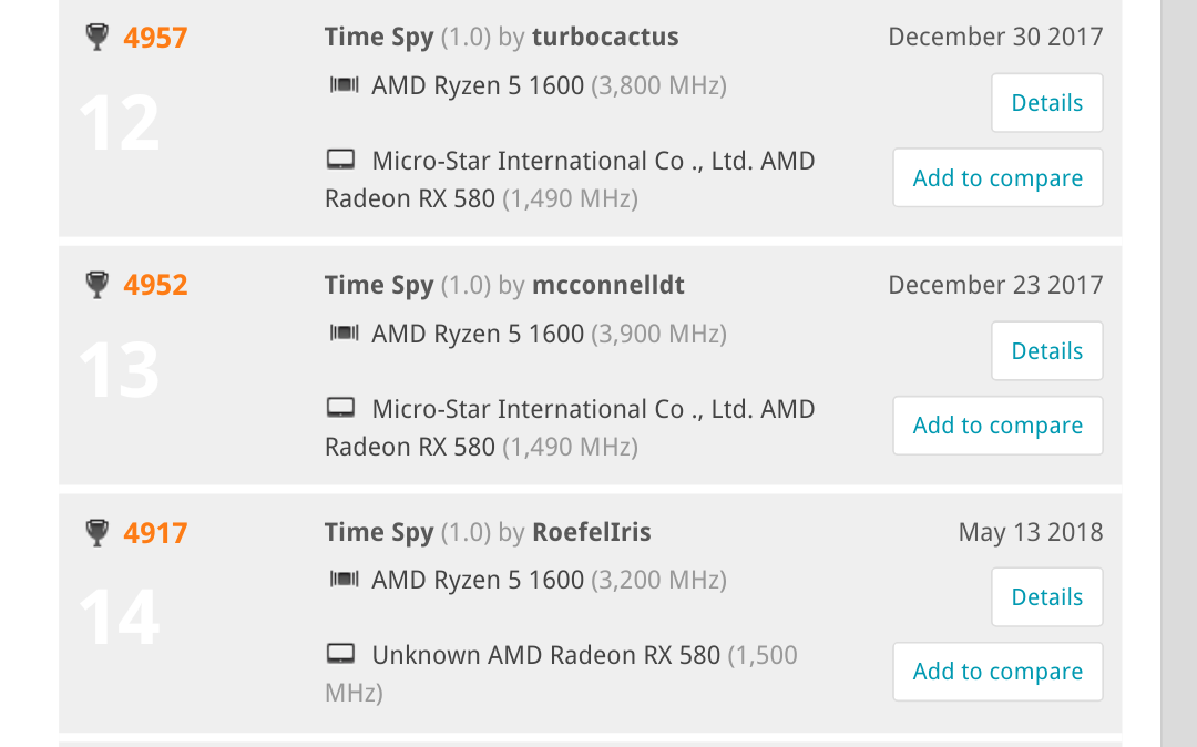 Met de Sapphire @GPU 1500 en mem@ 2100 met de AMD op 3900 score ik een 3Dmark score op TimeSpy van 4917.