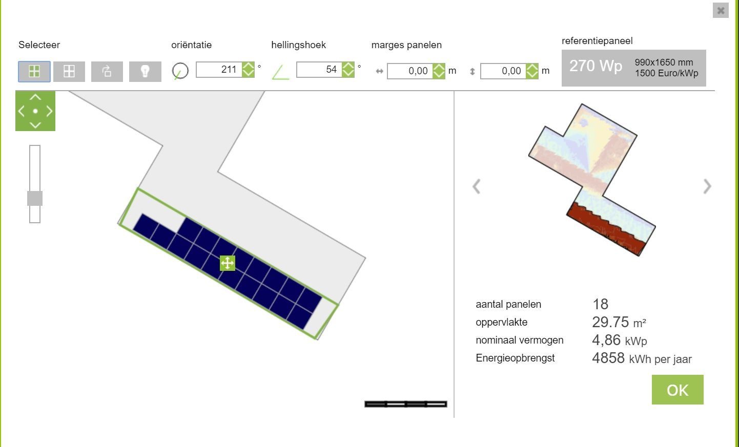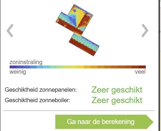 Ik wil graag mijn garage (zie foto hieronder bij de groene pijl) voorzien van zonnpanelen. Garage is 56 dakpannen breed (ongeveer 10 meter) en 12 dakpannen hoog en heeft een hellinghoek van 55 graden. De bovenkant van de foto is het noorden.