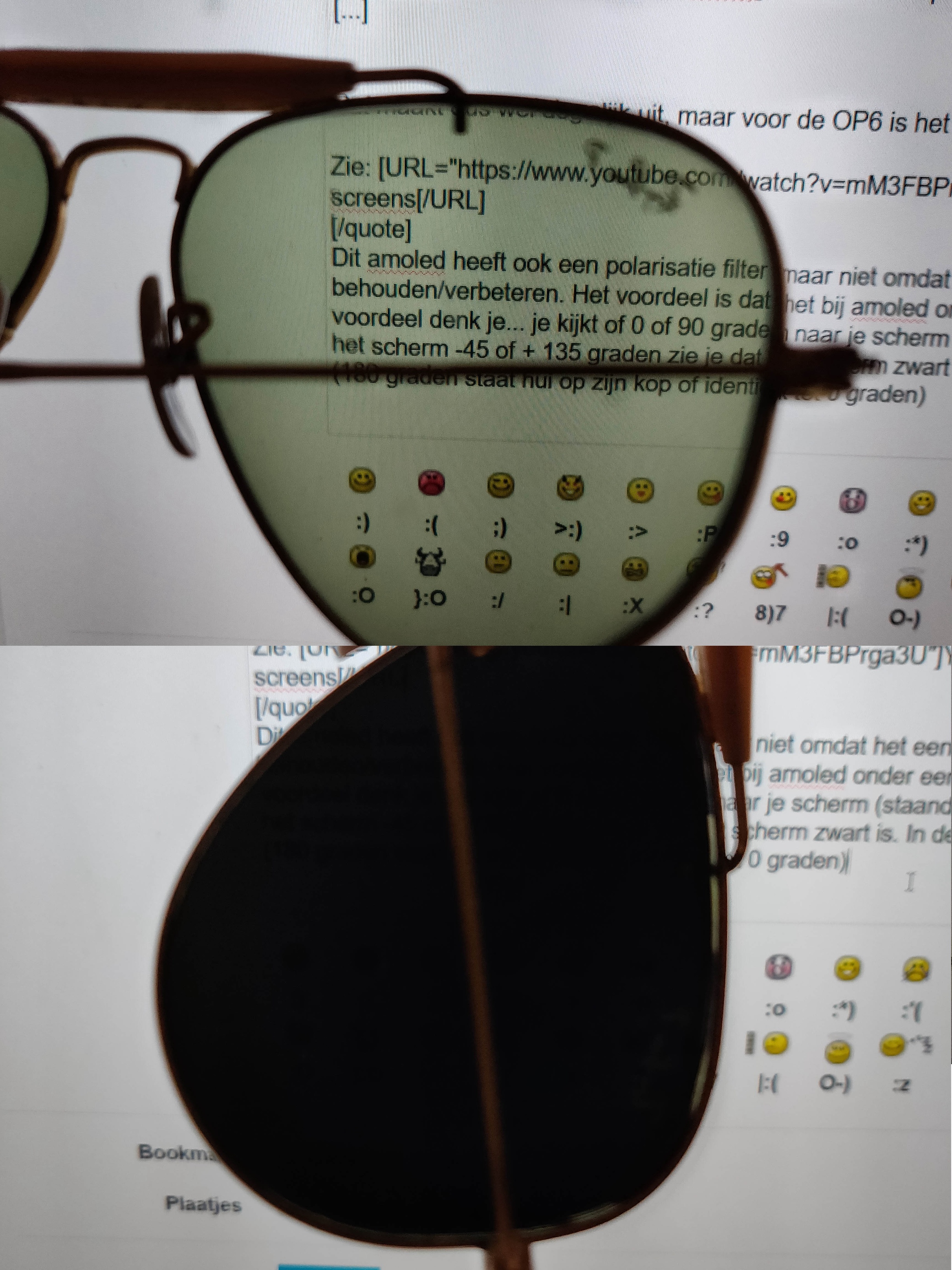 Dit amoled heeft ook een polarisatie filter maar niet omdat het een vereiste is maar om contrast te behouden/verbeteren. Het voordeel is dat het bij amoled onder een hoek van 45 graden is gedaan... hoezo een voordeel denk je... je kijkt of 0 of 90 graden naar je scherm (staand of liggend) en daarbij doet hij niks. kantel je het scherm -45 of + 135 graden zie je dat het scherm zwart is. In de praktijk is dit compleet geen probleem. (180 graden staat hij op zijn kop of identiek aan 0 graden)Ossi schreef op woensdag 30 mei 2018 @ 16:15: