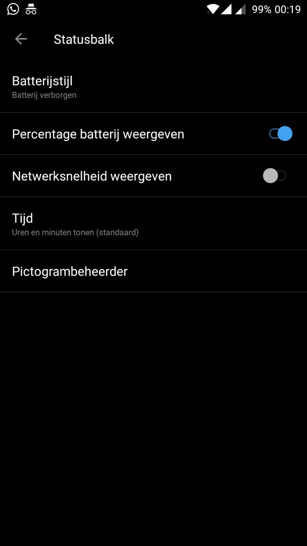 En idd, direct en percentage van batterij in statusbar mis ik... Het is wel te zijn als je je topmenu naar beneden slide.