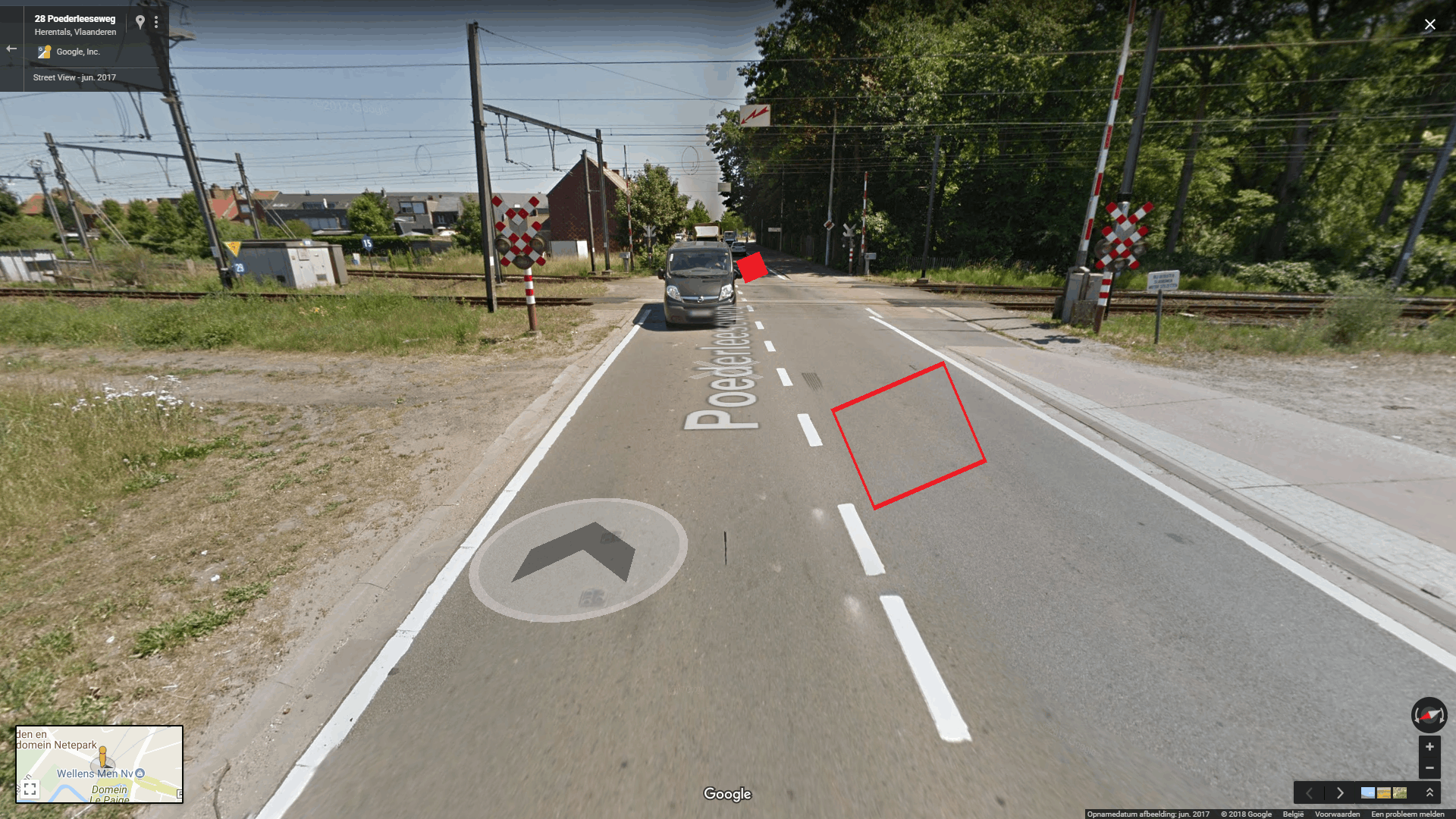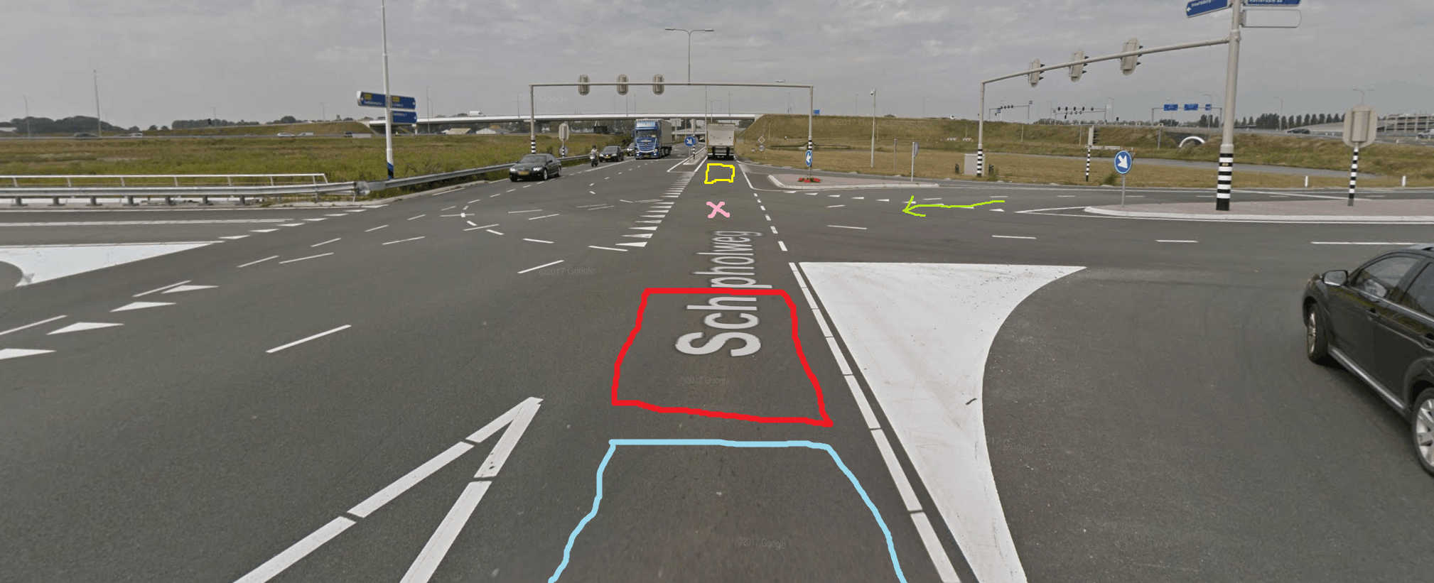 Ik stond op de met rood aangegeven plek, naast het verdrijvingsvlak, de opstopping was ver voor me, met geel aangegeven waar een auto stil stond te wachten, en de andere auto kwam dus van rechts, met de groene pijl aangegeven. Achter mij, met blauw aangegeven, stond het ook vol met auto's (ook na het verkeerslicht al), dus ik kon ook niet meer naar achteren rijden. De confrontatie vond plaats bij de onderbroken strepen, met een roze kruis aangegeven.