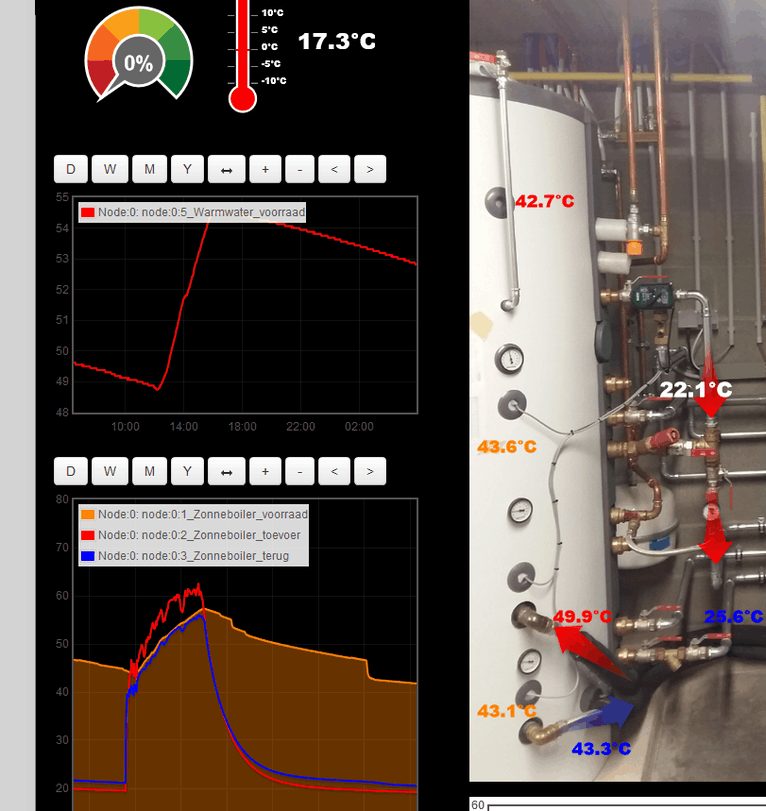 Ik ben voornamelijk bezig geweest met het maken van het uitlezen van mijn buffervat en zonneboiler. Dit heb ik nu in een mooi overzicht met wat grafieken en actuele waardes. Dit draait nu een weekje.