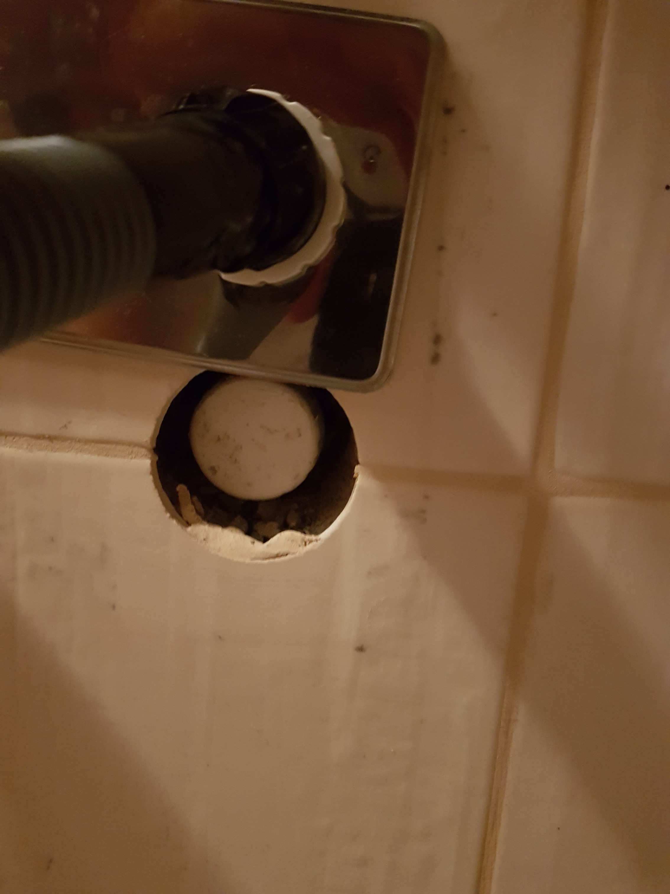 Ik denk dat er een zwanenhals in de muur verwerkt zit. We zijn hier net ingetrokken en het betreft een huurwoning, dus zeker weten doe ik het niet. Dat metalen plaatje dekt blijkbaar iets af, wat het precies is weet ik niet. Als ik het aan de kant schuif zie ik dit: