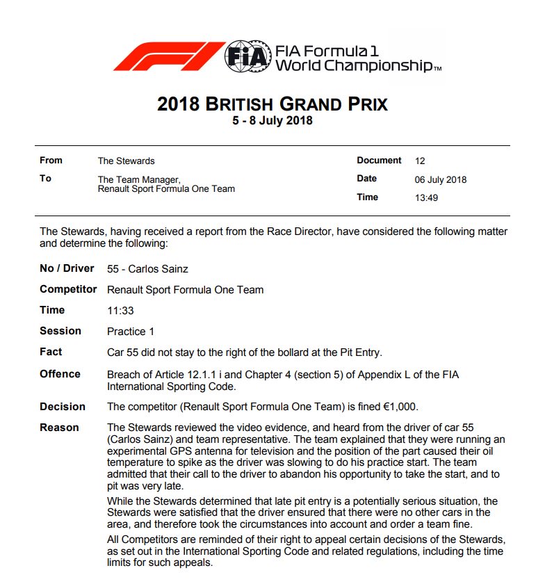SAI was nog tegen een boete aangelopen tijdens de eerste vrije training. Gelukkig valt 1K voor een F1 coureur nog wel mee.