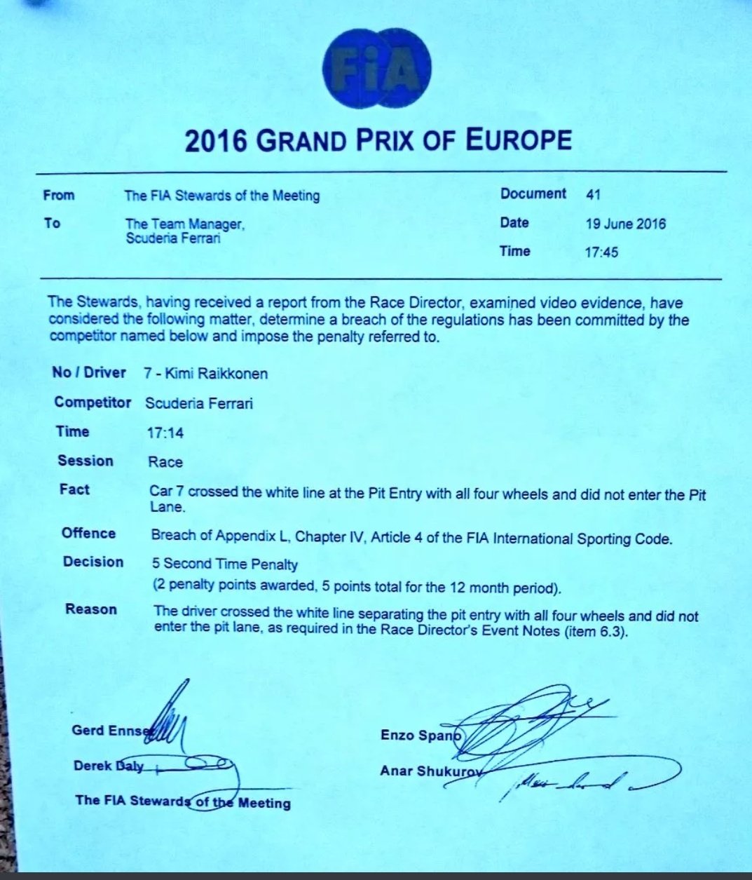 Massa kreeg dus een drive-through omdat 'ie over de witte lijn reed en niet naar binnen ging. Beetje hetzelfde idee als Hamilton nu dus (maar minder erg) en Raikkonen ("maar telt niet want Baku"). Massa is van die 3 vergelijkbare situaties het zwaarst bestraft en had zelfs voor Ferrari dure consequenties.