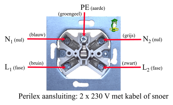 Ben wat verder gaan pluizen in de perilex problematiek. Blijkbaar is er niet één standaard. Uiteindelijk de wanddoos maar open geschroefd. Daarin zat bovenin tweemaal blauw en onderin tweemaal bruin (en uiteraard aarde). Dit komt overeen met een dubbele 230V, wat ook blijkt uit de gekoppelde twee zekeringen in de meterkast.