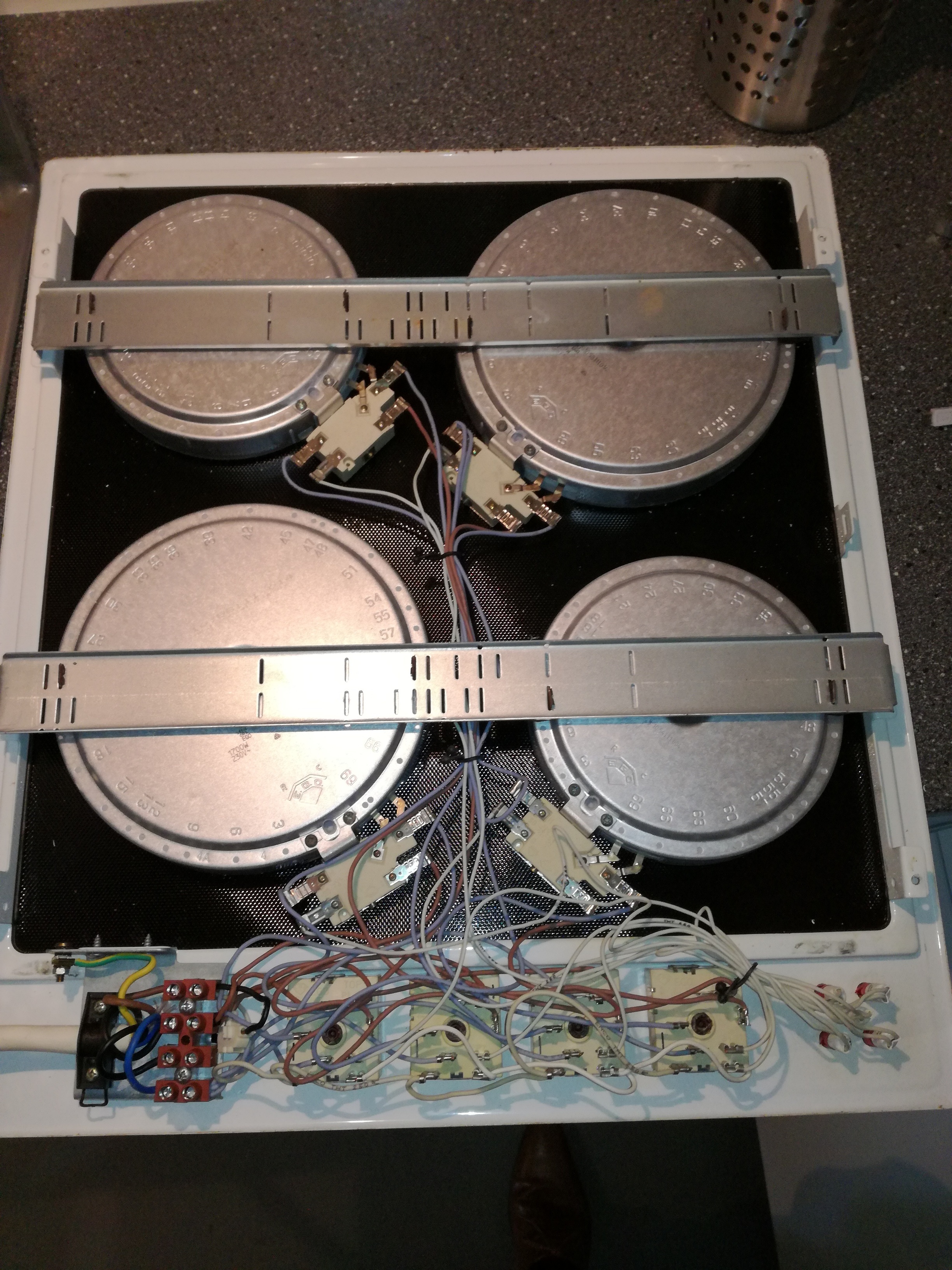 Zo gezegd, zo gedaan. Helaas werken na inkorten slechts 2 van de 4 kookpitten. Van tevoren de complete plaat niet getest, dus de oorzaak hiervan probeer ik al een tijdje te achterhalen. De twee zwarte omgedraaid, in het geval ik deze verwisseld had. Geen verschil.