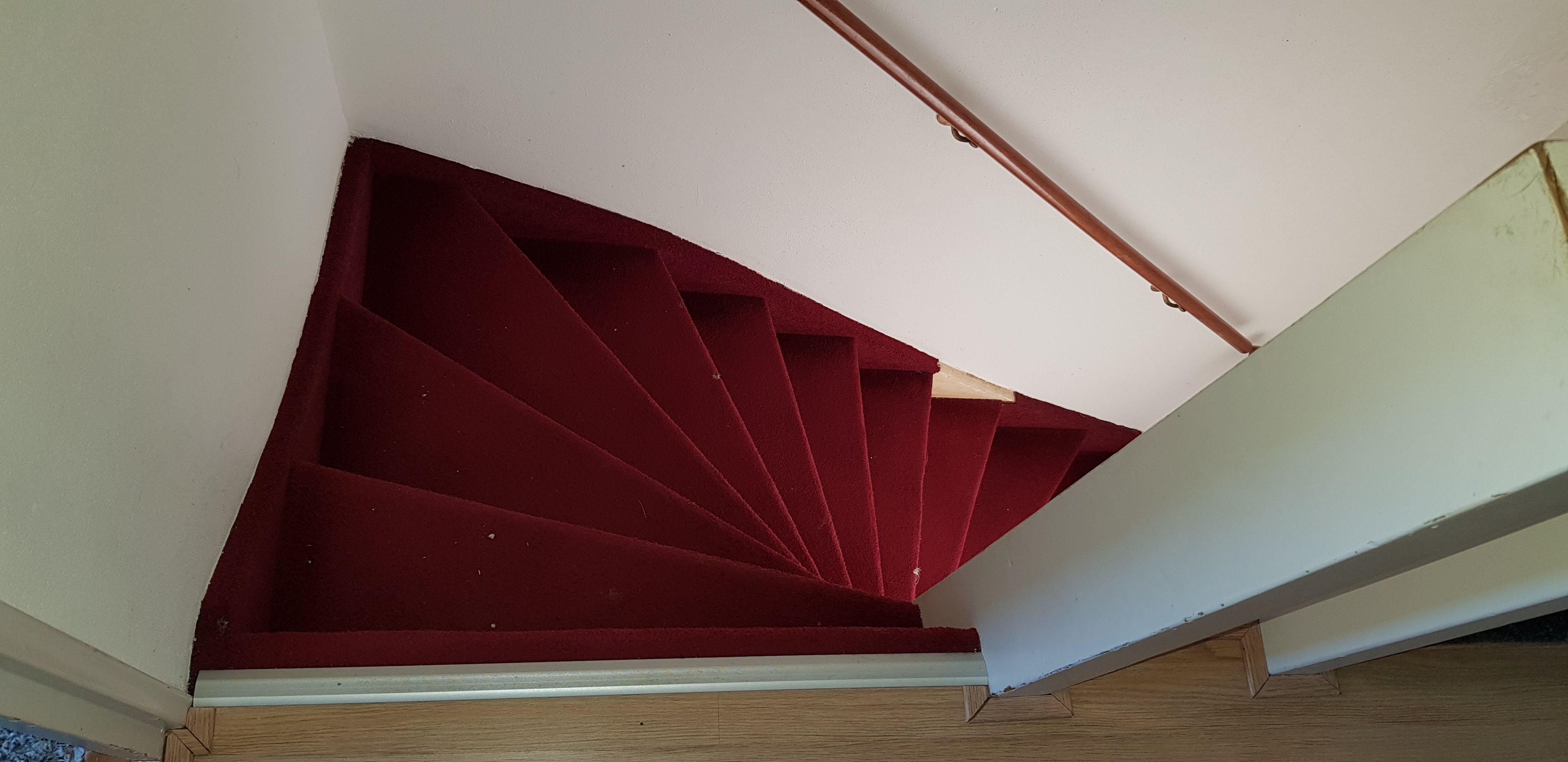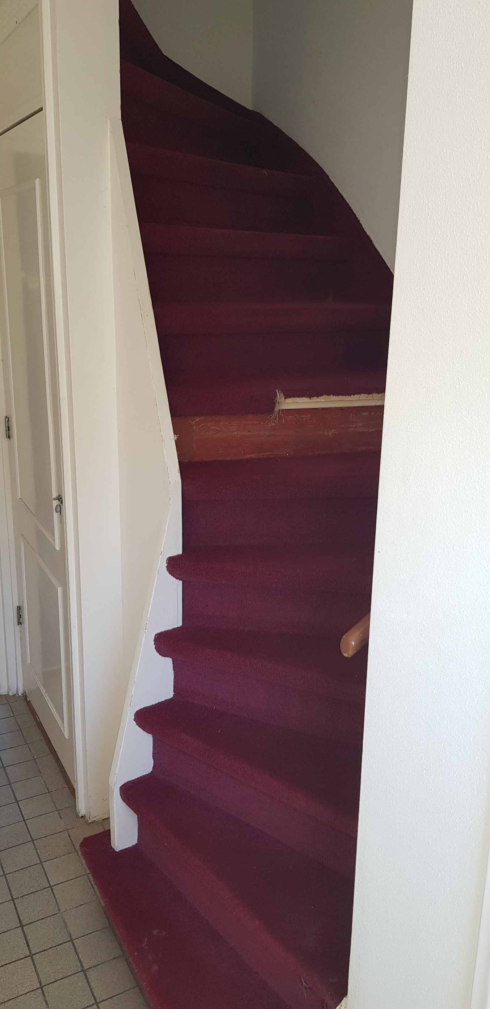 - Vloerbedekking verwijderen (zit nu verlijmd, inclusief zijkanten)