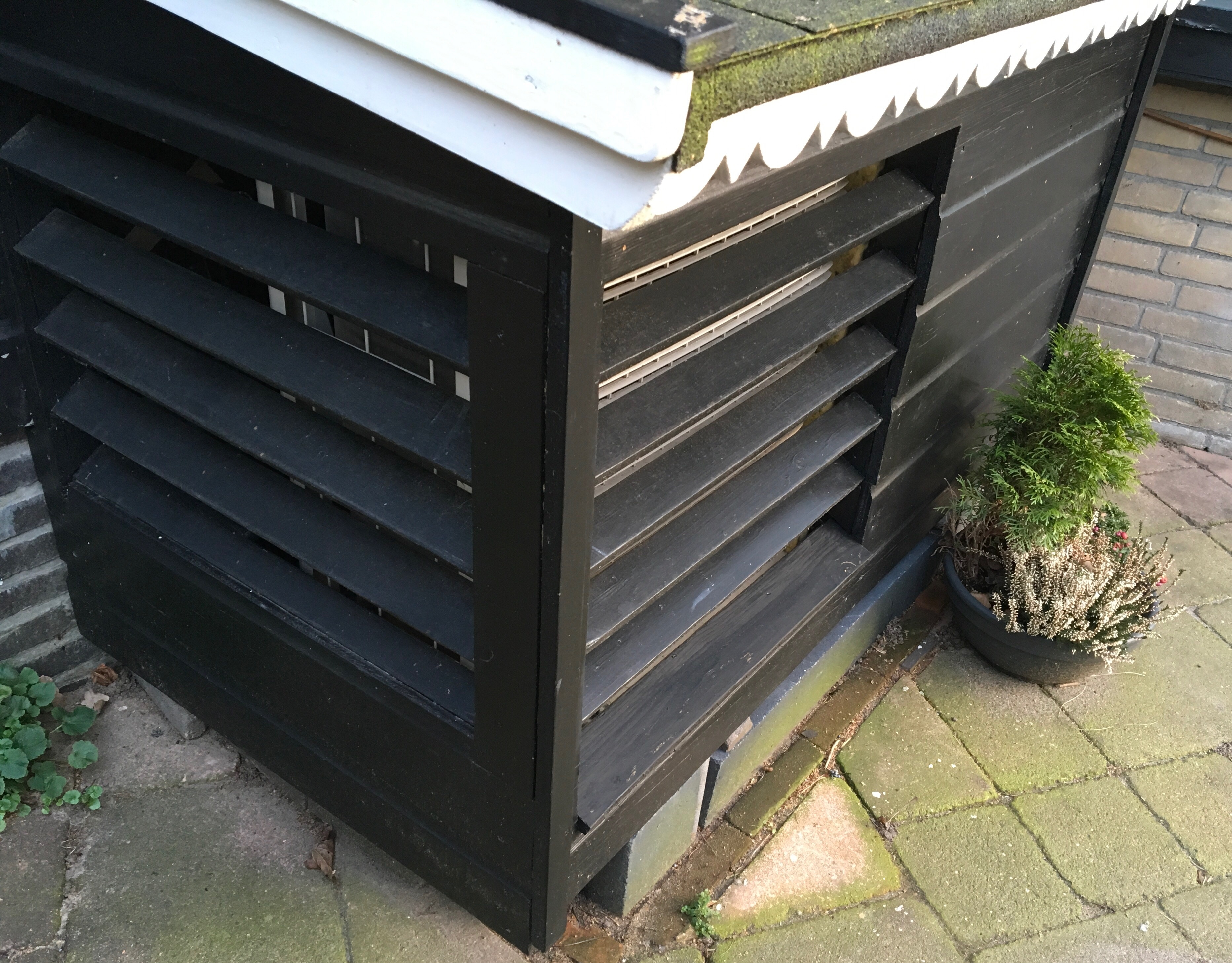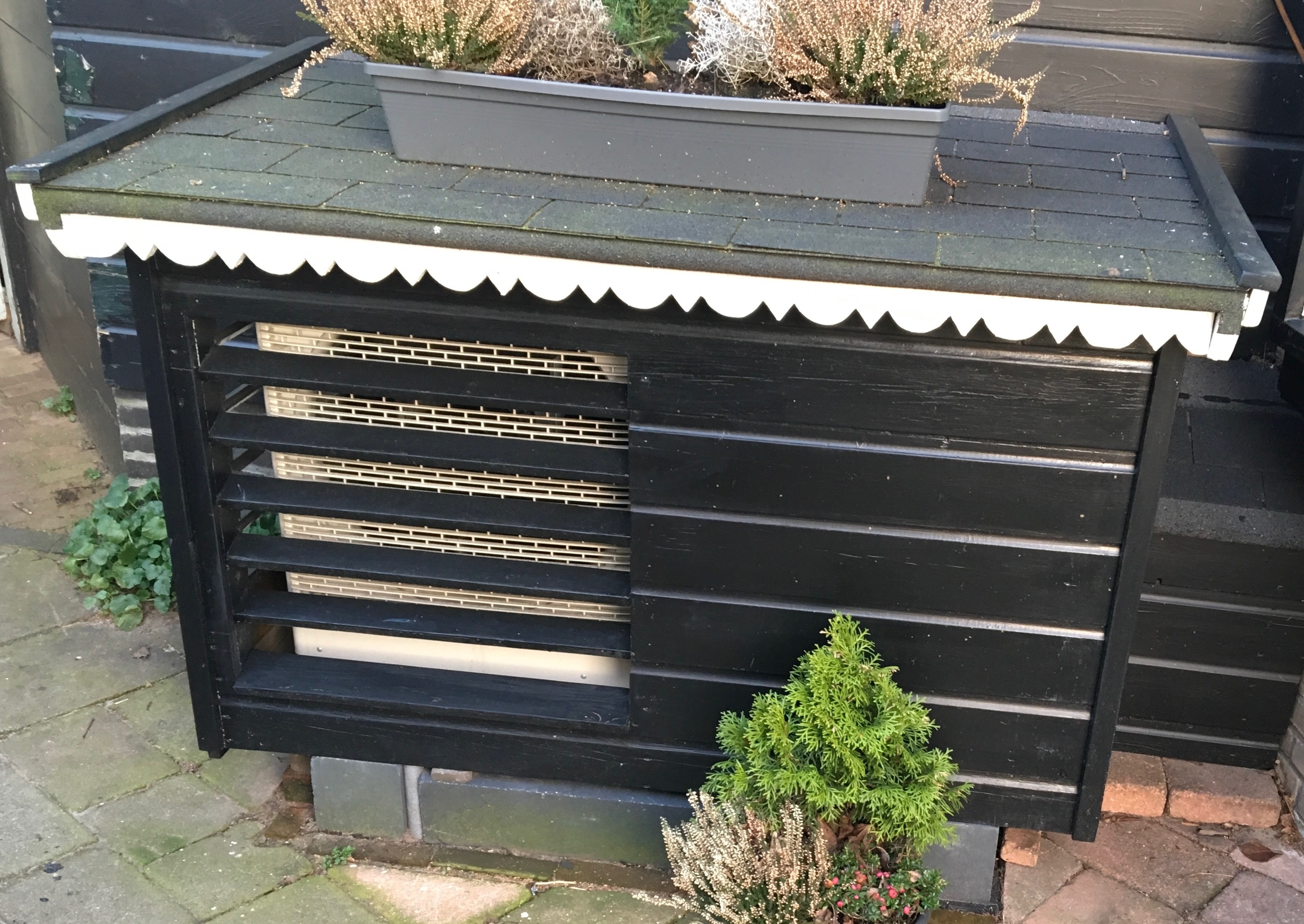 Omkasting gemaakt van sloophout. Geluidsisolatieplaten (vlokkenschuim) via marktplaats. Gemaakte kosten:1 pak dakshingles. Omdat het dak met shingels met twee personen eraf gehaald moet worden heb ik geen foto’s van de binnenzijde kunnen maken. Ter verkoming van evt resonantie/trillingen rust de omkasting niet op de stenen balken waar de warmtepomp op staat.