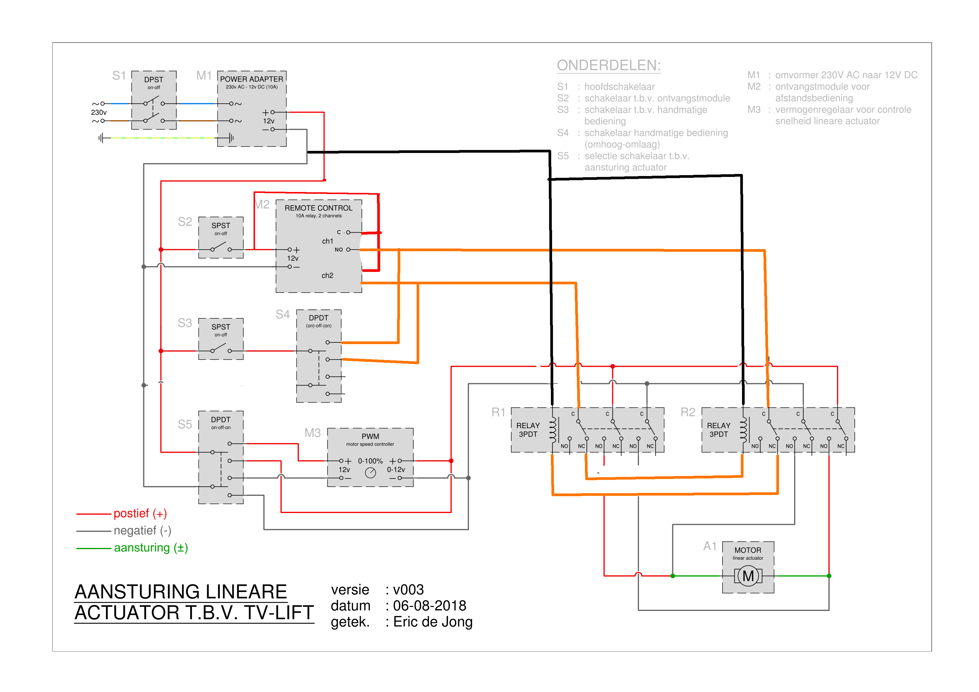 Het idee is dat de actuator zowel handmatig (S4) als via RF (M2) aangestuurd kan worden. Door middel van een schakelaar (S5) kan gekozen welke wijze van bediening men wil toepassen. Door de voltage aan te passen (M3) wil ik de snelheid van de actuator (en ook het geluidniveau) kunnen aanpassen.