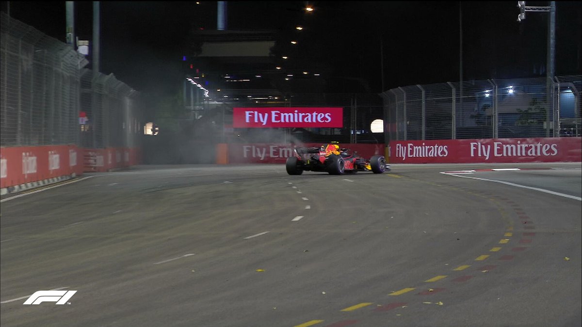 Die auto van Vettel kreeg een flinke klap bij die touche met de muur! Zoiets kan gewoon je versnellingsbak kosten!