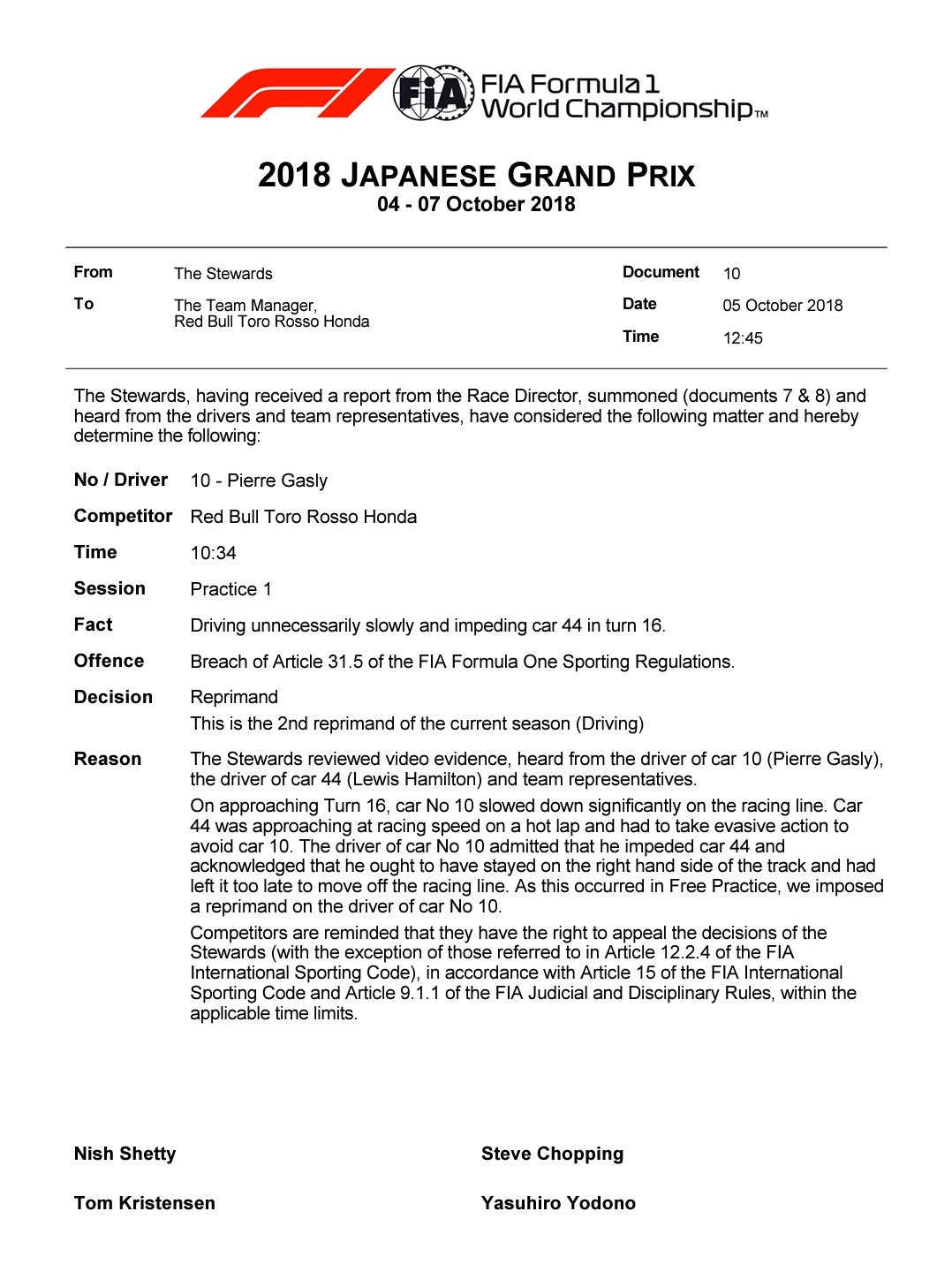 Gasly kreeg een reprimande voor het ophouden van Hamilton, gelukkig voor hem en Honda geen verdere gridstraf of dergelijk.