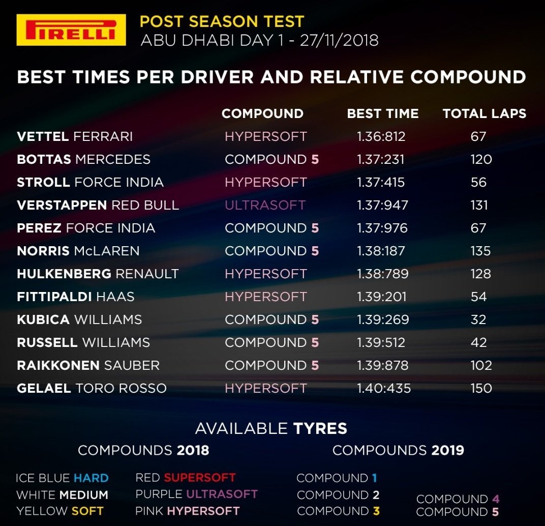 Vergelijken is sowieso lastig. Ten eerste heb je al de invloed van de nieuwe banden en andere omgeving (temperatuur etc). Daarnaast weten wij wel veel meer niet (maar het team dan wel). Hoe zit het met het gewicht van de auto/hoeveelheid brandstof? Wat is de afstelling van de auto? En zo zijn er nog wel meer dingen die invloed hebben op de ronde tijden.HeAdWaVe74 schreef op dinsdag 27 november 2018 @ 12:39: