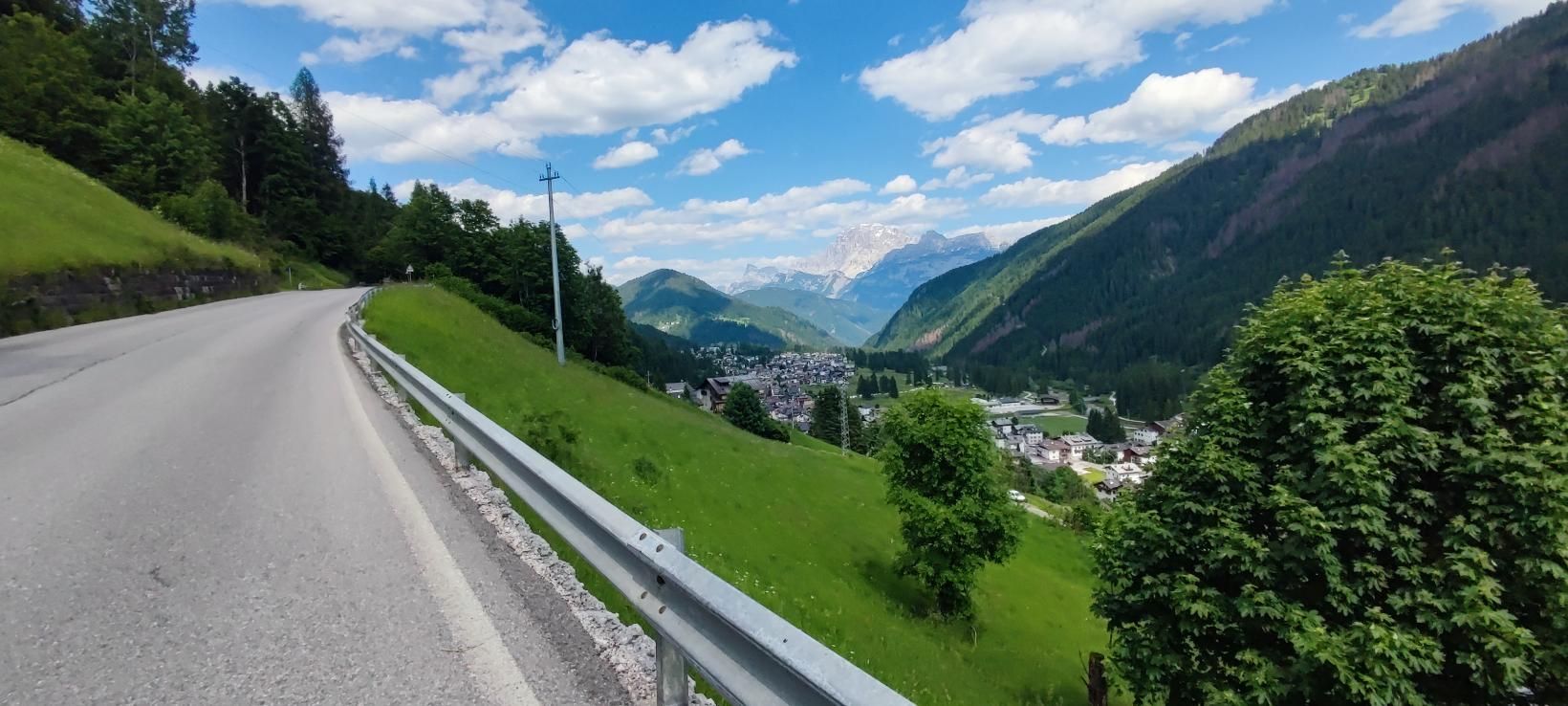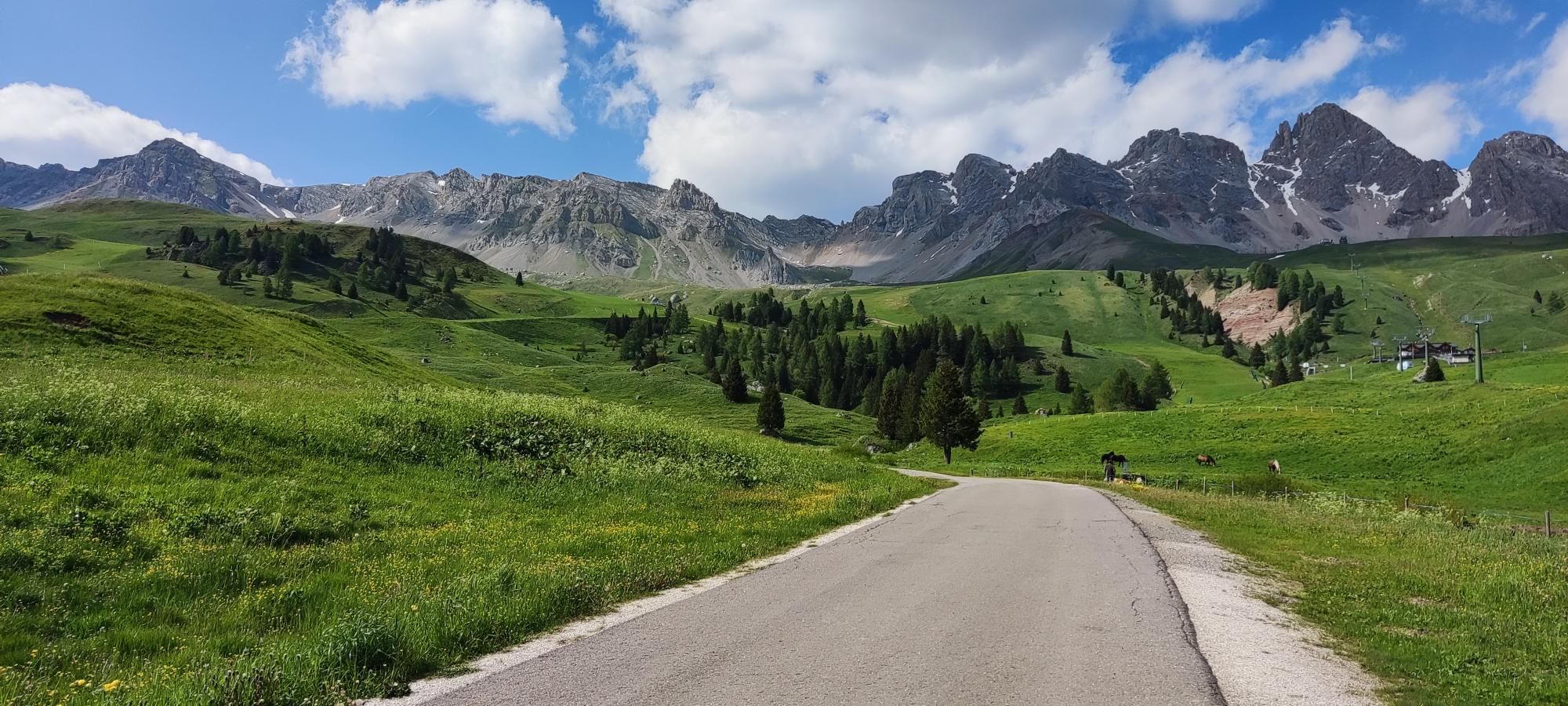 Doordat ik nog niet helemaal gewend was aan de ijlere lucht, maar ook zeker door de vermoeidheid van de rest van de klim en niet te vergeten de dag ervoor lukte het me niet om mijn te verwachten vermogens te trappen. Na die 3 kilometer afzien volgen nog 2 kilometer rechtdoor naar de top a 7,5%. De top zie je niet liggen, pas op het allerlaatst draai je naar rechts en kom je onder het viaduct door boven op ook weer een prachtig stukje Dolomieten waar je je ogen uitkijkt naar rotsmassieven, alpenweides en kuddes Milka-koeien.