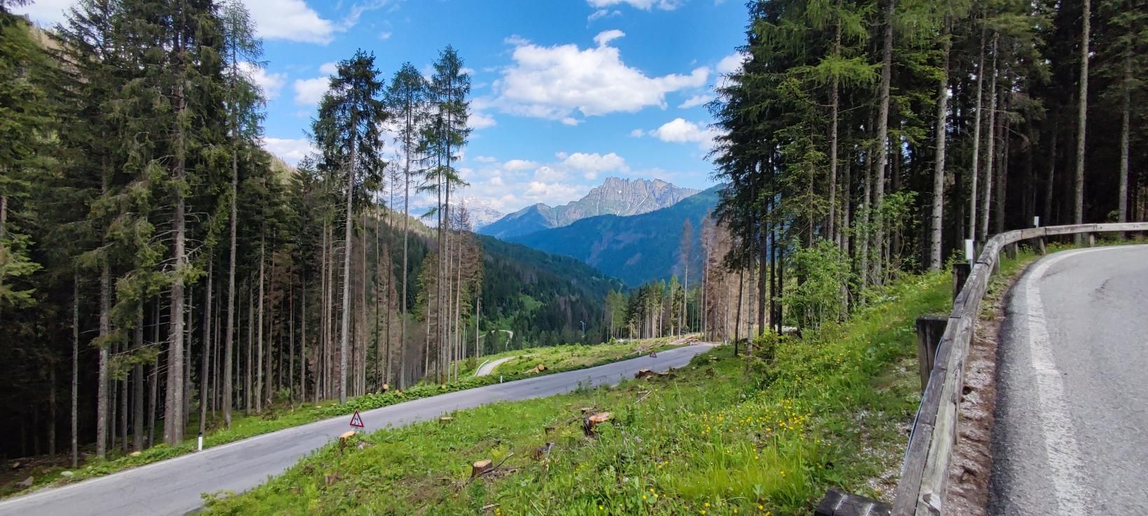 Bovenop genoten van een halve liter cola en apfelstrudel en daarna de laatste afdaling (naar Moena) in. Ik denk de lekkerste afdaling die ik ooit reed, ondanks het matige wegdek. Niet heel steil (10km 6-7%) maar zonder haarspeldbochten. Dus met af en toe even bijtrappen kon je heerlijk naar beneden zoeven.
