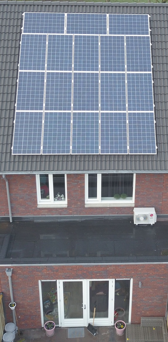 Een rij van 3 zonnepanelen (landscape), met daarboven een rij van 2 zonnepanelen (landscape), met een uitsparing ter hoogte van de airco.