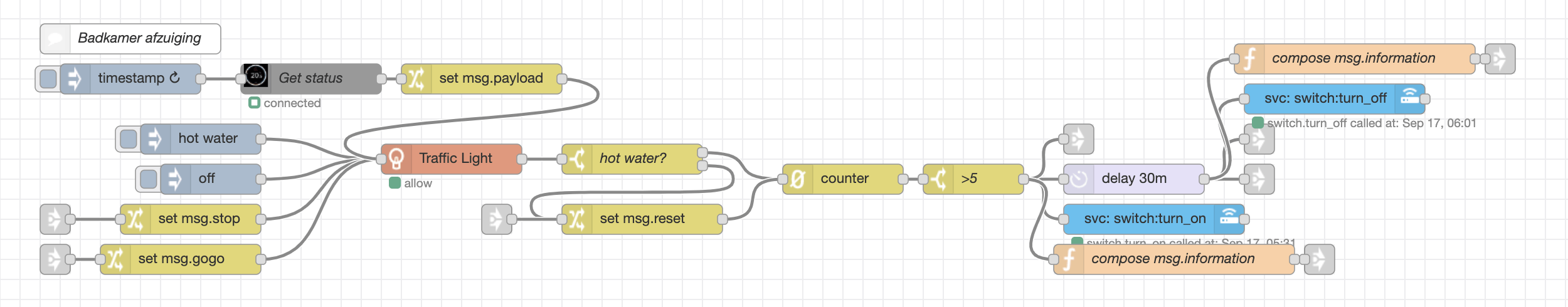 [{"id":"b26387e6.b756a8","type":"comment","z":"57b27d1b.16f004","name":"Run predefined program - 100% flame height to ecowave comfort","info":"","x":364,"y":980,"wires":[]},{"id":"d9927486.3697c8","type":"switch","z":"57b27d1b.16f004","name":"Evaluate DruControl State","property":"payload","propertyType":"msg","rules":[{"t":"eq","v":"COMFORT","vt":"str"},{"t":"eq","v":"ECO","vt":"str"},{"t":"eq","v":"OFF","vt":"str"}],"checkall":"true","repair":false,"outputs":3,"x":430,"y":1060,"wires":[["f5a7f25b.e9ce3"],["a622d26a.49b8c"],["6410654c.8806dc"]]},{"id":"1830d2bd.1baacd","type":"switch","z":"57b27d1b.16f004","name":"Evaluate DruStatus","property":"payload","propertyType":"msg","rules":[{"t":"eq","v":"15424","vt":"str"},{"t":"neq","v":"15424","vt":"str"}],"checkall":"true","repair":false,"outputs":2,"x":994,"y":960,"wires":[["16cf5c52.521b94"],["6d4abcc0.eb9414"]]},{"id":"c2d7d88.70cbf28","type":"switch","z":"57b27d1b.16f004","name":"Evaluate DruStatus","property":"payload","propertyType":"msg","rules":[{"t":"eq","v":"15424","vt":"num"},{"t":"neq","v":"15424","vt":"num"}],"checkall":"true","repair":false,"outputs":2,"x":994,"y":1060,"wires":[["c3989f71.12cb3"],["7a69563f.e8bf78"]]},{"id":"cdf10470.b227f8","type":"switch","z":"57b27d1b.16f004","name":"Evaluate DruStatus","property":"payload","propertyType":"msg","rules":[{"t":"eq","v":"15424","vt":"num"},{"t":"neq","v":"15424","vt":"num"}],"checkall":"true","repair":false,"outputs":2,"x":994,"y":1200,"wires":[[],["de48f2c7.600ea"]]},{"id":"5de44339.12cfdc","type":"modbus-write","z":"57b27d1b.16f004","name":"40200","showStatusActivities":true,"showErrors":true,"unitid":"2","dataType":"HoldingRegister","adr":"40200","quantity":"1","server":"2ed1d669.4e523a","x":2474,"y":1020,"wires":[[],[]]},{"id":"e033c4e0.6d6398","type":"comment","z":"57b27d1b.16f004","name":"Action register","info":"","x":2504,"y":980,"wires":[]},{"id":"de48f2c7.600ea","type":"change","z":"57b27d1b.16f004","name":"Turn DRU OFF","rules":[{"t":"set","p":"payload","pt":"msg","to":"1","tot":"num"}],"action":"","property":"","from":"","to":"","reg":false,"x":1224,"y":1200,"wires":[["5de44339.12cfdc"]]},{"id":"16cf5c52.521b94","type":"change","z":"57b27d1b.16f004","name":"Turn DRU ON (all burners)","rules":[{"t":"set","p":"payload","pt":"msg","to":"101","tot":"num"}],"action":"","property":"","from":"","to":"","reg":false,"x":1254,"y":880,"wires":[["5de44339.12cfdc","3dee4beb.951424"]]},{"id":"3dee4beb.951424","type":"delay","z":"57b27d1b.16f004","name":"","pauseType":"delay","timeout":"5","timeoutUnits":"seconds","rate":"1","nbRateUnits":"1","rateUnits":"second","randomFirst":"1","randomLast":"5","randomUnits":"seconds","drop":false,"x":1304,"y":920,"wires":[["aafce51b.630c48"]]},{"id":"2ce6f610.63015a","type":"modbus-write","z":"57b27d1b.16f004","name":"40201","showStatusActivities":true,"showErrors":true,"unitid":"2","dataType":"HoldingRegister","adr":"40201","quantity":"1","server":"2ed1d669.4e523a","x":2474,"y":1100,"wires":[[],[]]},{"id":"b9d0436.1fc5ac","type":"comment","z":"57b27d1b.16f004","name":"Flame Height register","info":"","x":2524,"y":1060,"wires":[]},{"id":"aafce51b.630c48","type":"change","z":"57b27d1b.16f004","name":"Set Flame Height to 100%","rules":[{"t":"set","p":"payload","pt":"msg","to":"100","tot":"num"}],"action":"","property":"","from":"","to":"","reg":false,"x":1544,"y":880,"wires":[["2ce6f610.63015a","c262f496.e89aa8"]]},{"id":"c262f496.e89aa8","type":"delay","z":"57b27d1b.16f004","name":"","pauseType":"delay","timeout":"10","timeoutUnits":"minutes","rate":"1","nbRateUnits":"1","rateUnits":"second","randomFirst":"1","randomLast":"5","randomUnits":"seconds","drop":false,"x":1594,"y":940,"wires":[["2000fa72.64d0d6"]]},{"id":"2000fa72.64d0d6","type":"change","z":"57b27d1b.16f004","name":"Activate EcoWave","rules":[{"t":"set","p":"payload","pt":"msg","to":"105","tot":"num"}],"action":"","property":"","from":"","to":"","reg":false,"x":1814,"y":880,"wires":[["5de44339.12cfdc","9cbf5e57.f3dc5"]]},{"id":"77f3012b.ab0ae","type":"modbus-write","z":"57b27d1b.16f004","name":"40420","showStatusActivities":true,"showErrors":true,"unitid":"2","dataType":"HoldingRegister","adr":"40420","quantity":"1","server":"2ed1d669.4e523a","x":2474,"y":1180,"wires":[[],[]]},{"id":"c084492f.2eaed8","type":"comment","z":"57b27d1b.16f004","name":"Eco Wave interval time","info":"","x":2524,"y":1140,"wires":[]},{"id":"9cbf5e57.f3dc5","type":"delay","z":"57b27d1b.16f004","name":"","pauseType":"delay","timeout":"1","timeoutUnits":"seconds","rate":"1","nbRateUnits":"1","rateUnits":"second","randomFirst":"1","randomLast":"5","randomUnits":"seconds","drop":false,"x":1844,"y":920,"wires":[["45eb9634.5b7348"]]},{"id":"45eb9634.5b7348","type":"change","z":"57b27d1b.16f004","name":"Set EcoWave interval","rules":[{"t":"set","p":"payload","pt":"msg","to":"15","tot":"num"}],"action":"","property":"","from":"","to":"","reg":false,"x":2064,"y":880,"wires":[["77f3012b.ab0ae","6207c377.44c78c"]]},{"id":"6207c377.44c78c","type":"delay","z":"57b27d1b.16f004","name":"","pauseType":"delay","timeout":"1","timeoutUnits":"seconds","rate":"1","nbRateUnits":"1","rateUnits":"second","randomFirst":"1","randomLast":"5","randomUnits":"seconds","drop":false,"x":2104,"y":920,"wires":[["5d1b1cf6.919994"]]},{"id":"5d1b1cf6.919994","type":"function","z":"57b27d1b.16f004","name":"Startup Values","func":"msg.payload = { value:[2569,3340,3854,3342,2572,1801,773,514,1027,2054], \n'fc': 16, \n'unitid': 2, \n'address': 40421, \n'quantity': 10 } \nreturn msg","outputs":1,"noerr":0,"x":2504,"y":1260,"wires":[["4b5958e9.3fd888"]]},{"id":"4b5958e9.3fd888","type":"modbus-flex-write","z":"57b27d1b.16f004","name":"test flex write","showStatusActivities":true,"showErrors":true,"server":"2ed1d669.4e523a","x":2750,"y":1300,"wires":[[],[]]},{"id":"8b5f6d3a.aee4b","type":"comment","z":"57b27d1b.16f004","name":"Eco Wave Scene - Comfort","info":"","x":2544,"y":1220,"wires":[]},{"id":"f0acfe61.64aa2","type":"comment","z":"57b27d1b.16f00