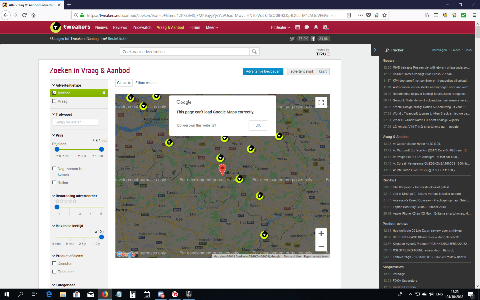 Die licentie moet je sowieso al hebben, anders kun je de API überhaupt niet gebruiken. Wat echter wél relevant is, is de melding op de console van je browser:PcDealer schreef op donderdag 4 oktober 2018 @ 13:51: