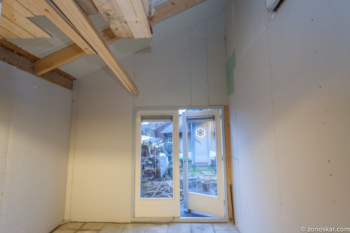 . In die achterwand hebben we zelf de doorgang voor een open keuken gemaakt middels een stalen balk. Ook zelf al het leidingwerk, elektra etc. etc. gedaan.