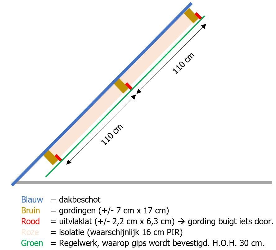 Als volgt opgelost:Ruimteverlies dus dikte van het gips +2mm. Correct uitlijnen van de lat was wel even stoeien, daar heb ik wat malletjes voor gemaakt. Foto hieronder zitten alleen de rachels om de 60cm er op, toen de isolatie ertussen zat (steenwol) is er daar uiteraard nog één tussen gekomen. HoH van de regels had ik de breedte van de rol isolatie aangehouden (80cm?)