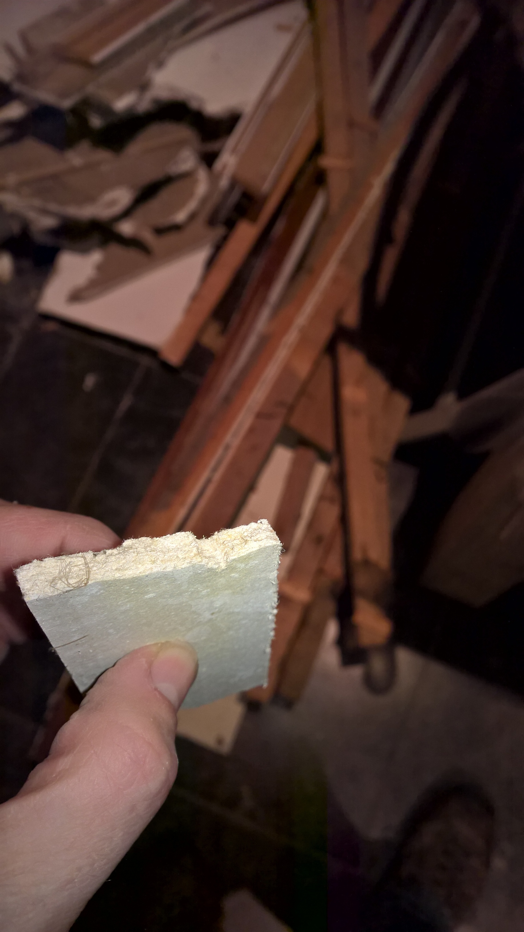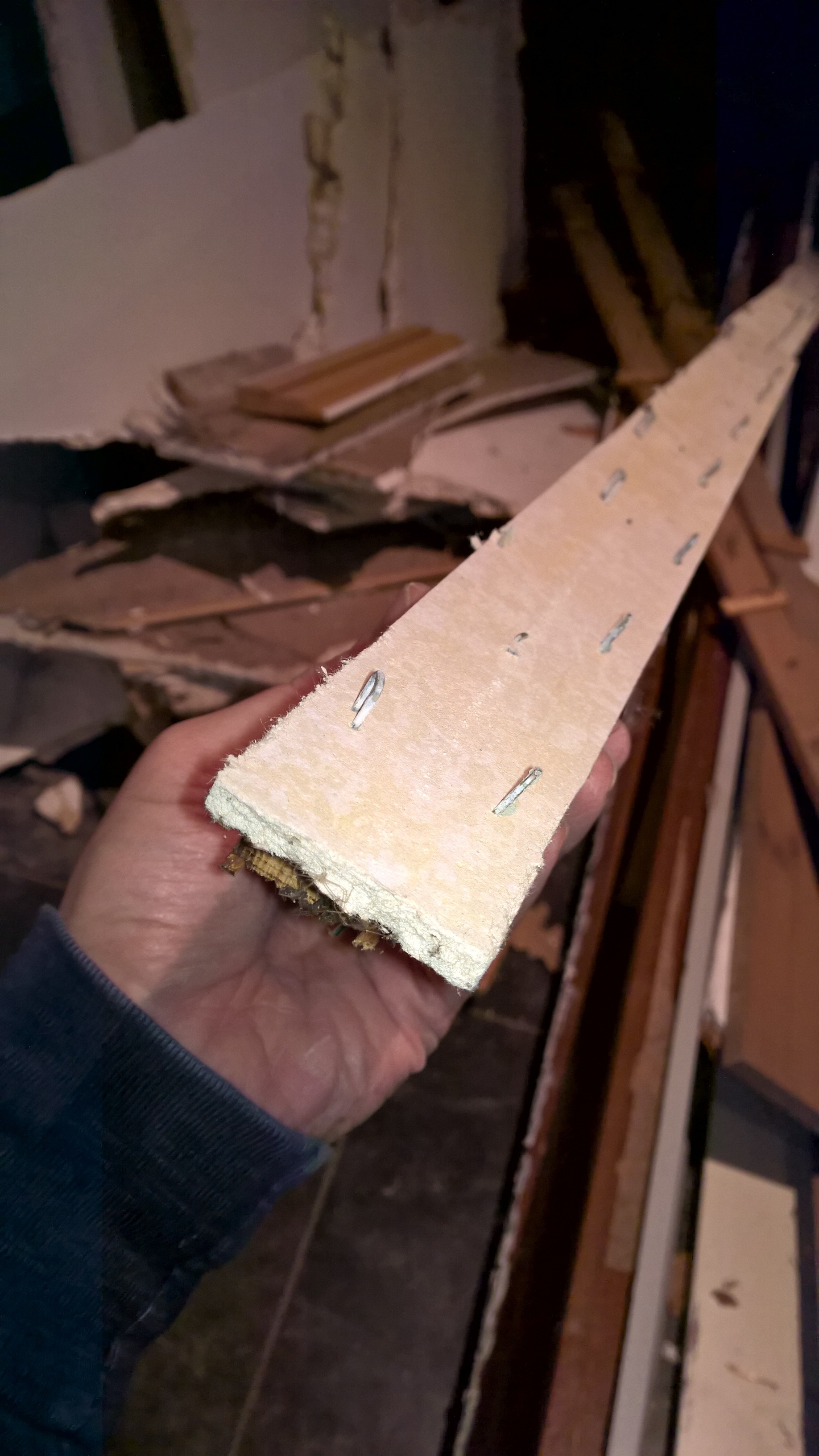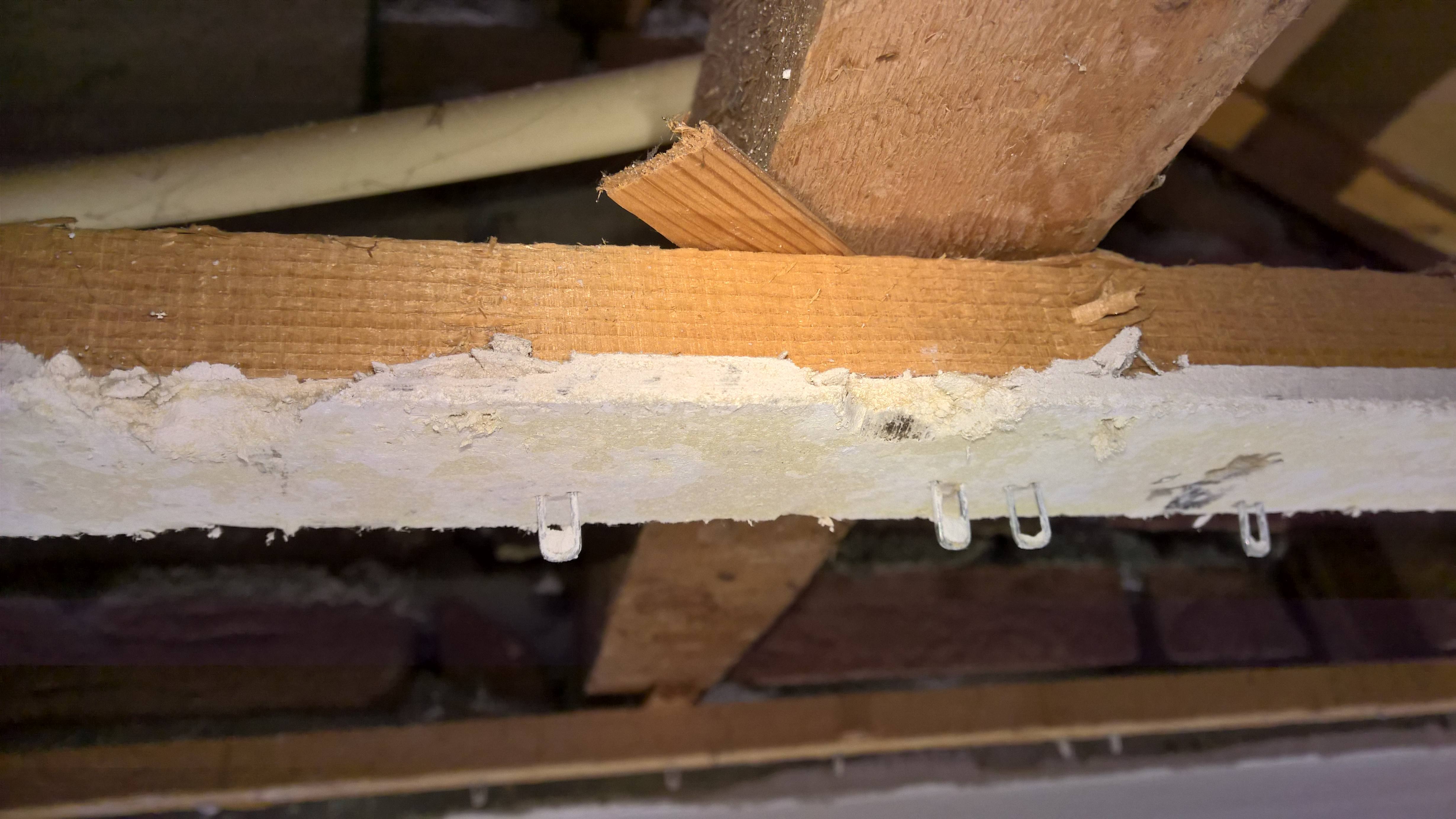 Plafond was zo beneden, maar halverwege kwam ik een materiaal tegen waarvan ik niet zo kan zeggen wat het is. Het was een gips plafond geslagen tegen panlatten die geëgaliseerd waren met spietjes en dus dat spul.