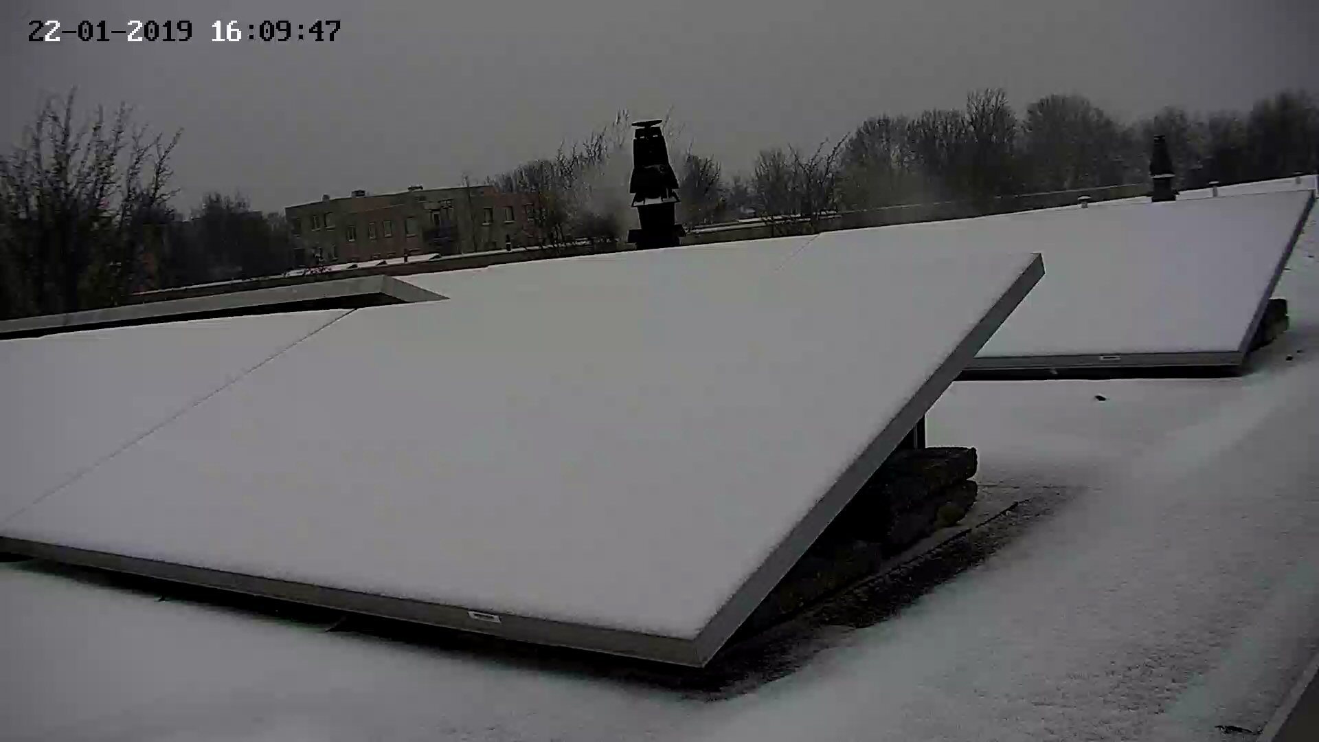 Ik heb net even op het dak gekeken, maar het is gistren wat gesmolten en weer vast gevroren op sommige panelen. Dus eraf blazen of vegen moet je dan ook direct doen als het valt lijkt me.