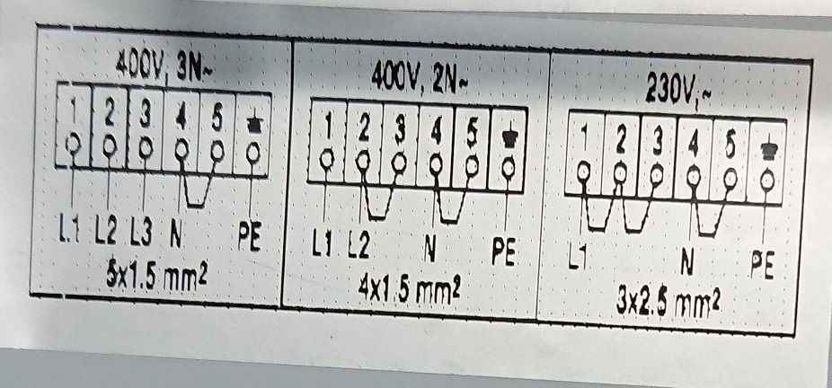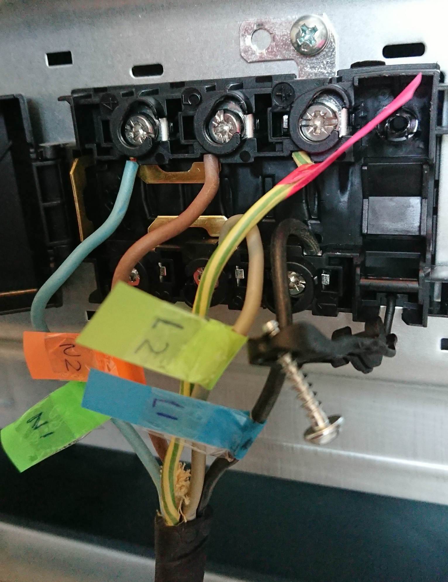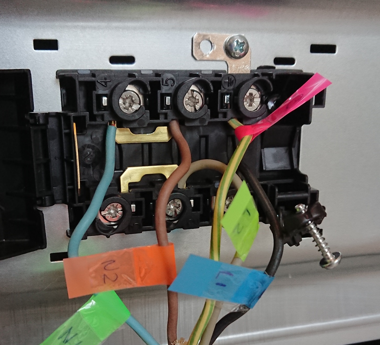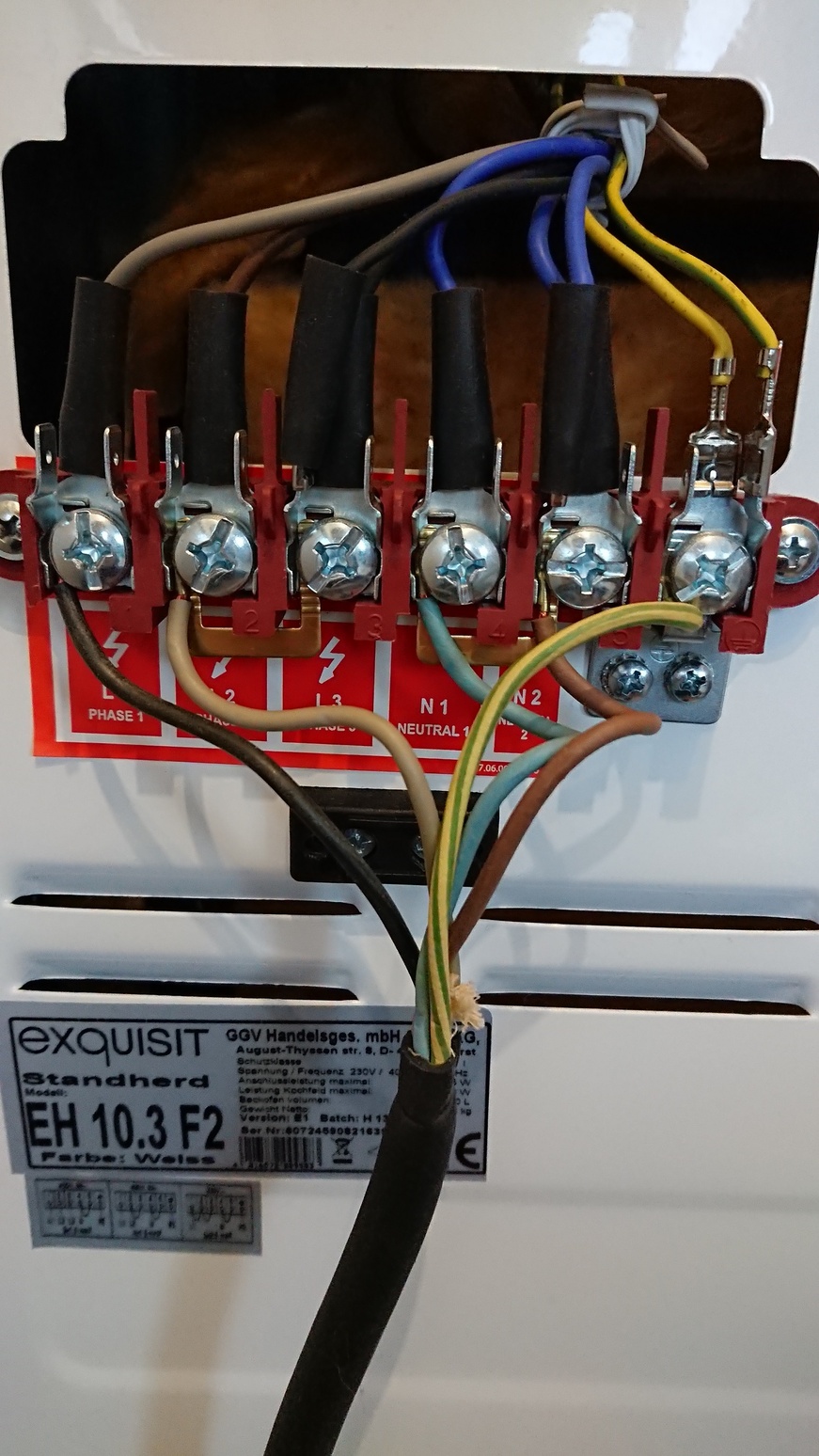 Ik heb onlangs een nieuw inductiefornuis gekocht ter vervanging van mijn elektrische fornuis. Nu heb ik deze net aangesloten en wil ik nog even een laatste check of alles goed zit. Het vorige fornuis is destijds door een elektriciën aangesloten, alles werkte naar behoren, hierom denk ik dat elk draadje nu op de juiste plek met juiste tag hangt (zie foto 1 & 2). Het nieuwe fornuis is eigenlijk bedoeld voor 3 fases, ik sluit hem hier aan op 2 (dubbele 230V groep, 2x fase, 2x neutraal en aarde, ik ken de beperking dat er dan niet met vol vermogen gekookt kan worden). De leverancier van het fornuis had een schema meegegeven hoe het geheel aan te sluiten op 2 fases, welke ik naar mijn idee goed heb gevolgd, hier wil ik graag even bevestiging van hebben.
