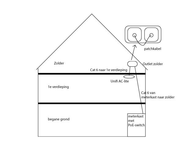 Nu is het voorstel van de installateur om een cat6 kabel naar zolder te trekken (in een bestaande loze leiding) en deze aan te sluiten op een outlet. Dan een gat te boren door de dekvloer naar het plafond op de eerste verdieping en deze met een patch kabel aan te sluiten. (Zie situatie schets)