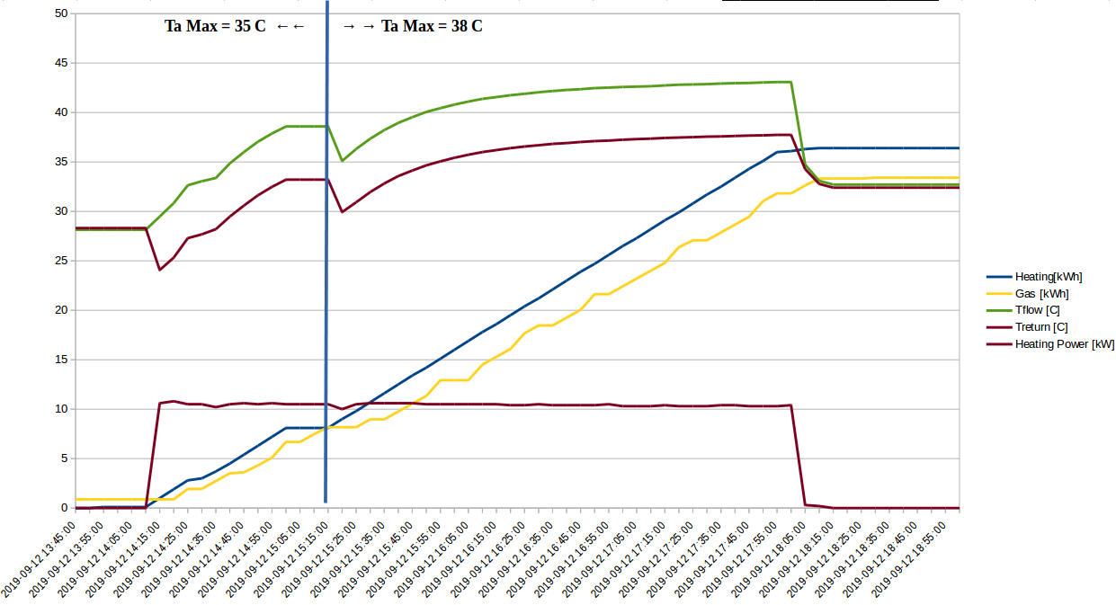 Begonnen met 35oC als max aanvoer temperatuur, maar nadat de ta op 38oC uitkwam ging hij pendelen en toen heb ik de max ta maar verhoogd naar 38oC, gevolg langzaam aan gaat de ketel toch naar ta=43oC want hij kan de warmte onder huidige omstandigheden niet kwijt. Ik ben benieuwd of dit beter gaat als het binnen wat kouder is dan 21.5oC en er ook meer warmte verlies is doordat het buiten kouder is.