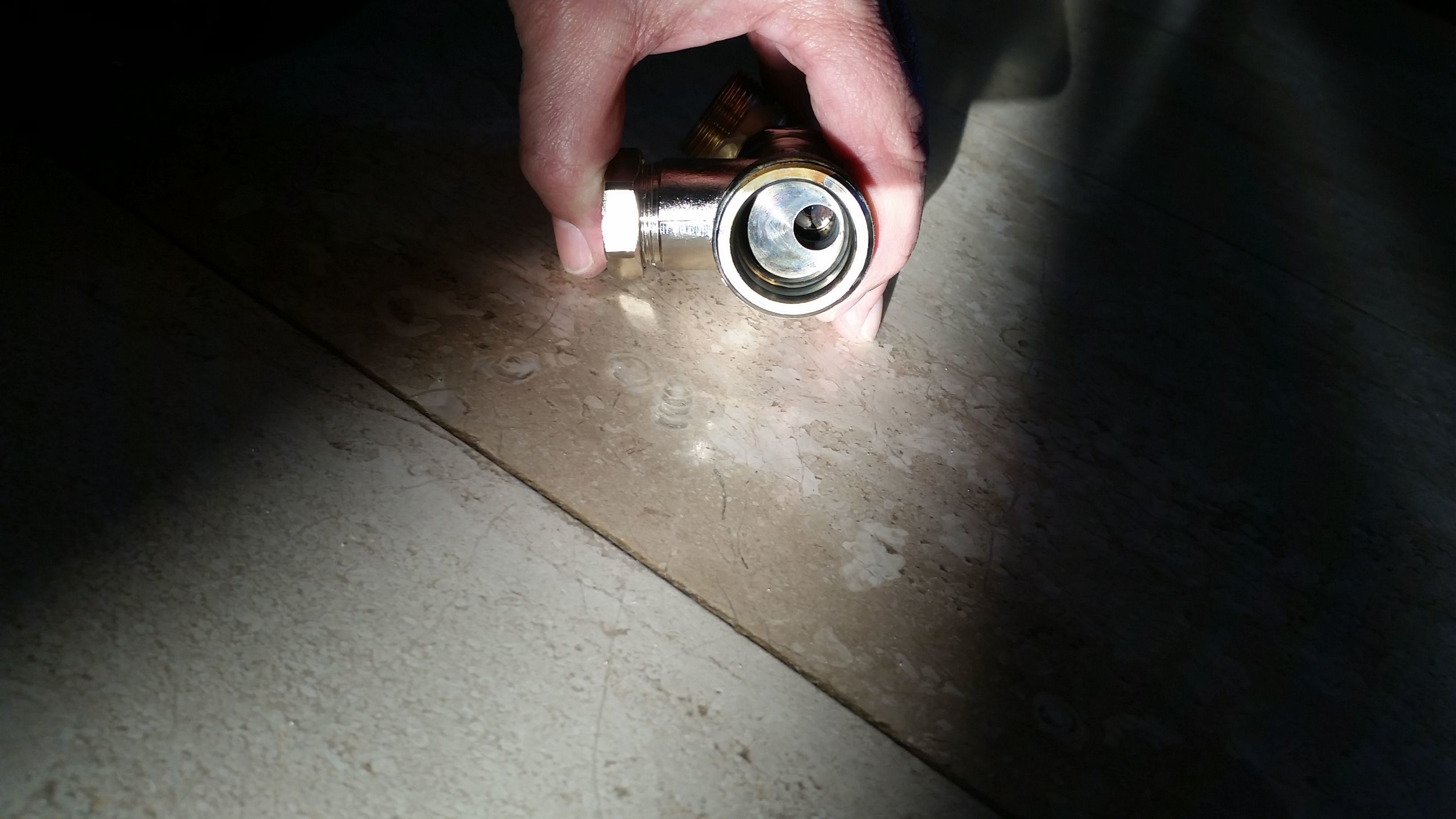 Uiteindelijk de boel opengeschroefd en zowel voetventiel als thermostaat bleken een veel te nauwe opening te hebben in de volledig open stand, zie foto: leidingen 22mm en opening 9,3 mm.