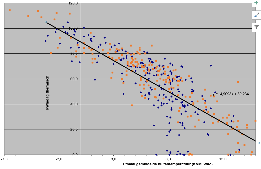 In mijn metingen zie ik zomaar een volle punt COP verschil tussen 5oC of 10oC buitentemperatuur. Gecombineerd met de 0,5oC afkoeling van de Tbinnen vormt dat de basis van mijn strategie.