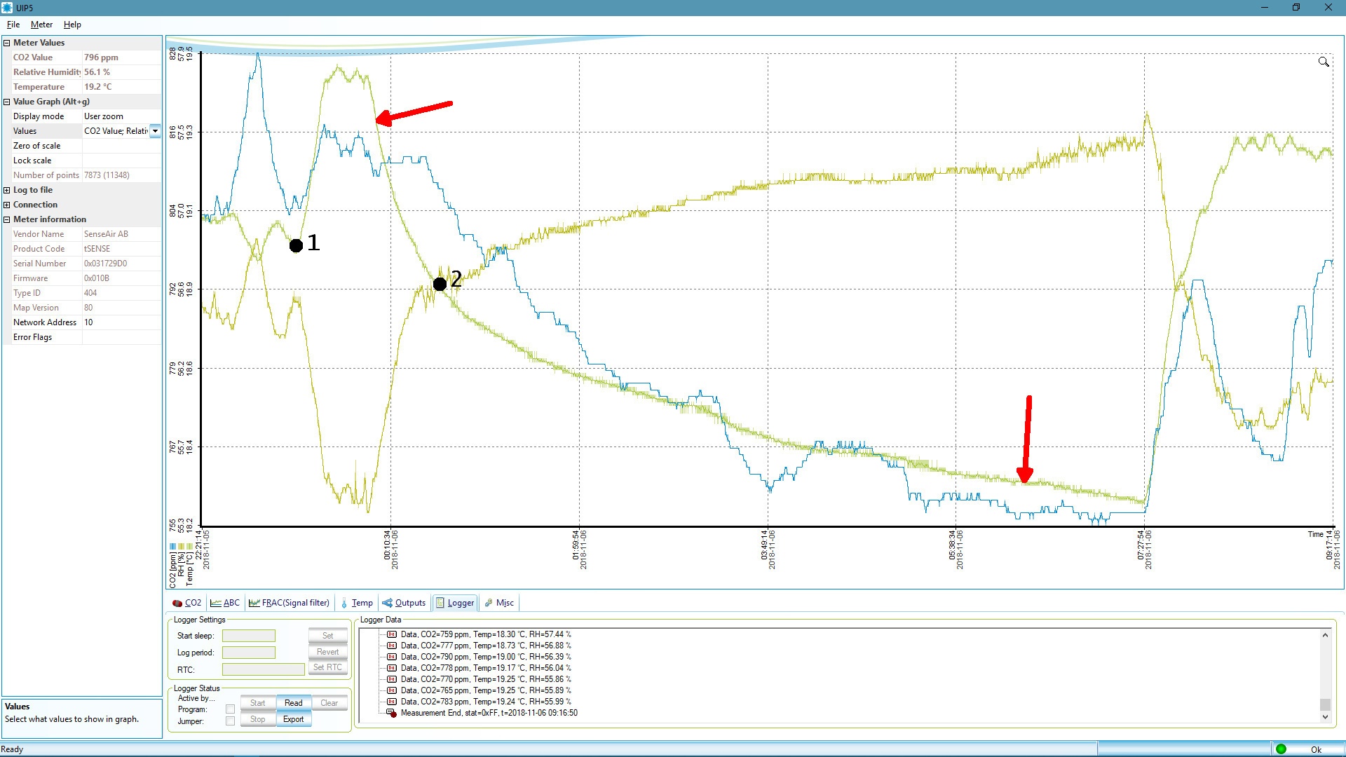 Je ziet dat s'nachts de wanden de woning opwarmen en overdag als de ruimte temperatuur hoger is dan de wanden er warmteoverdracht omgekeerd plaats vindt.. De (zwaare) woning is een prachtige energiebuffer met een tijdconstante van ongeveer 24 uur.