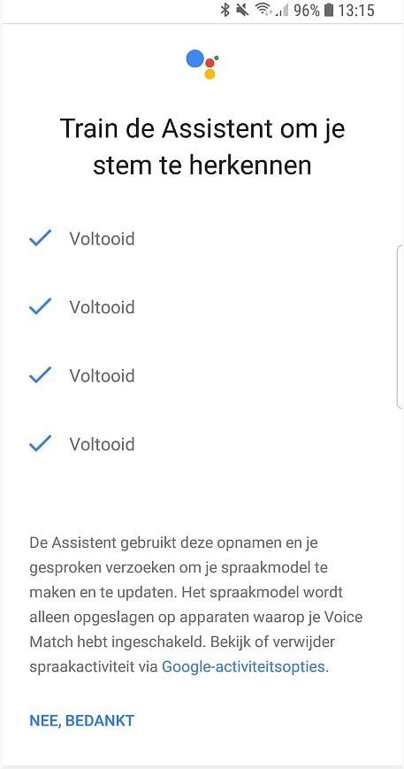 maar de voice match instelling werkt niet, je moet meerdere malen oke google en hey google zeggen (reageert hij wel op) maar zodra ik de stappen juist heb voltooid doet hij niks, het scherm blijft zeg maar staan.