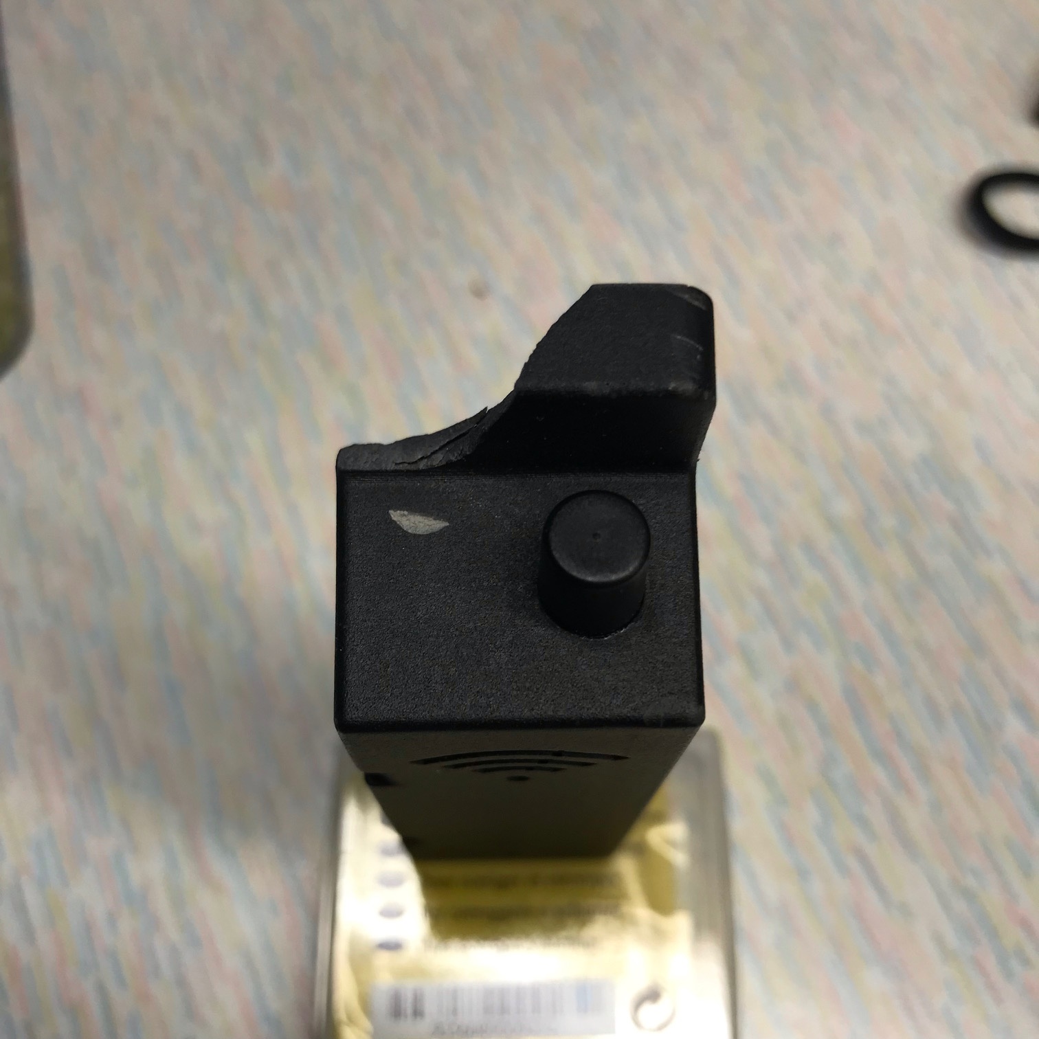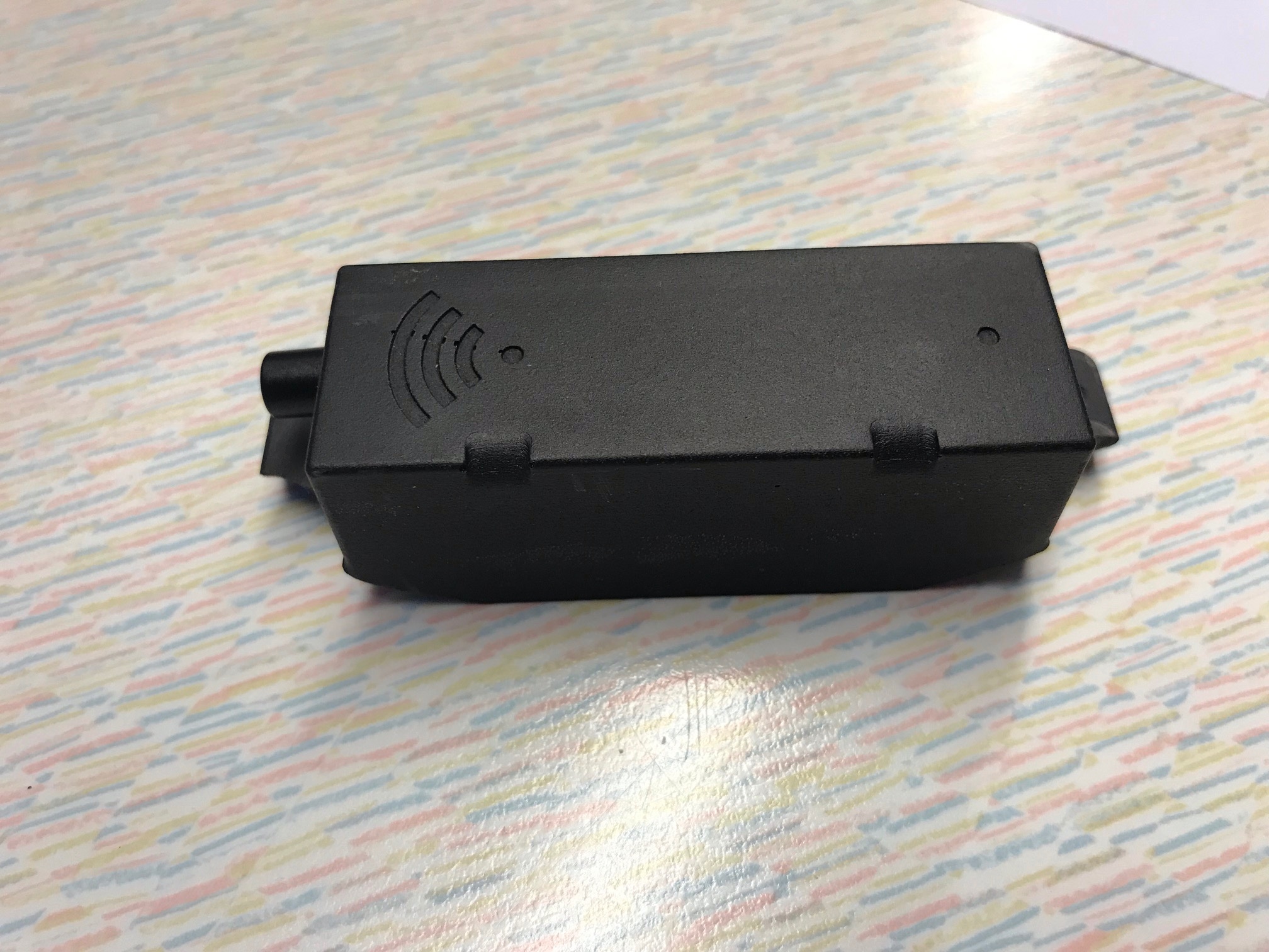 Ik vond dit ding op mijn werk. Het heeft het WIFI symbool èn aan onderzijde het "gooi niet in de container" symbool. Verder zit er op 1 hoek een bevestigingsgat en ik gok dat deze zich ook aan de overzijde bevond.