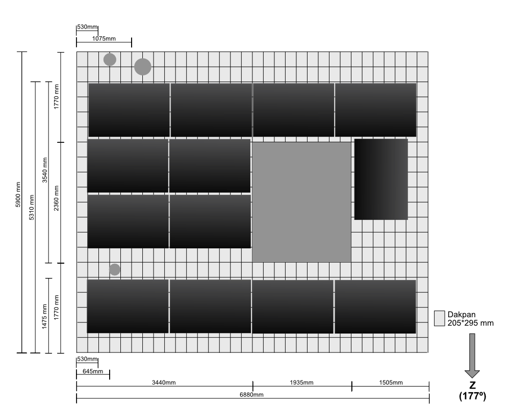Wat op dit moment niet op de foto/tekening staat is het platte dak van de keuken van ± 2,2x2,6m, waar ook twee panelen in 10º portrait op het zuiden komen te liggen.