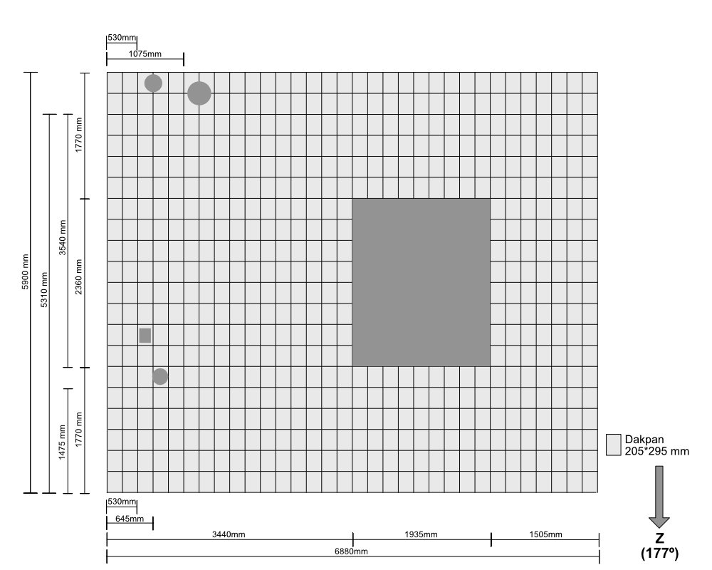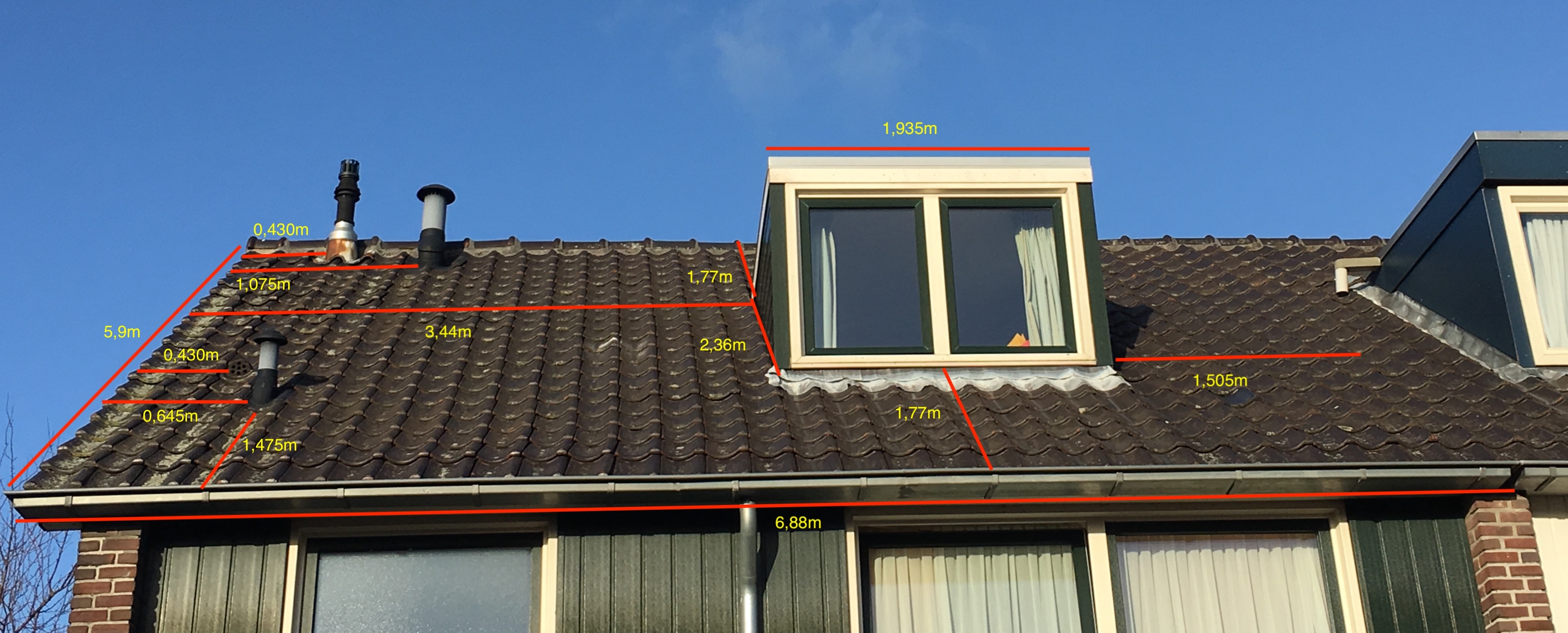 Het dak ligt pal op het zuiden, is 6,88m breed en 5,9m "hoog". De hellingsgraad weet ik niet precies, maar zit ergens rond de 40-45º. Er zit een dakkapel en een paar pijpjes (zie foto en tekening). Verder geen schaduw.
