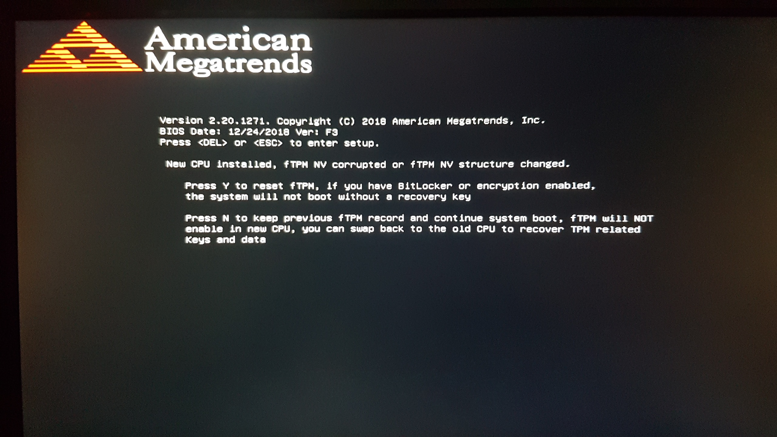 "new cpu installed ftpm nv corrupted or ftpm nv structure changed"
