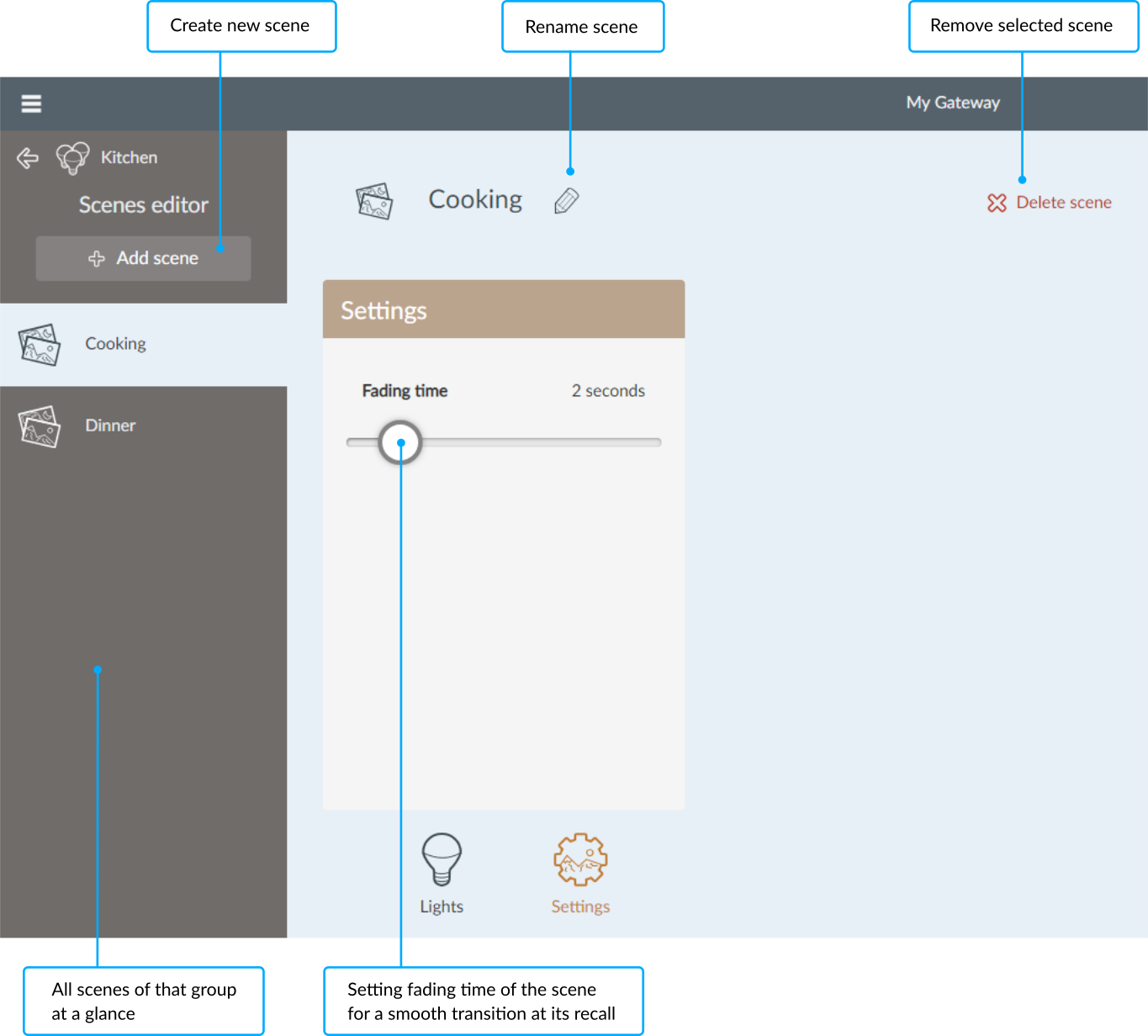 - scene aangemaakt; alle lampen aan, fading time, 5 minutes