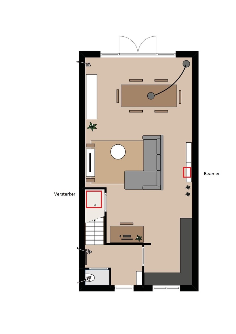 In ons oude huis stond de versterker redelijk dicht bij de PC en de beamer waardoor het aansluiten redelijk makkelijk was. In het nieuwe huis staat de beamer een eind verderop waardoor het lastiger is om de boel op elkaar aan te sluiten. Overigens loopt er onder het hele huis een kruipruimte waar eventueel naartoe geboord kan worden om kabels doorheen te laten lopen.