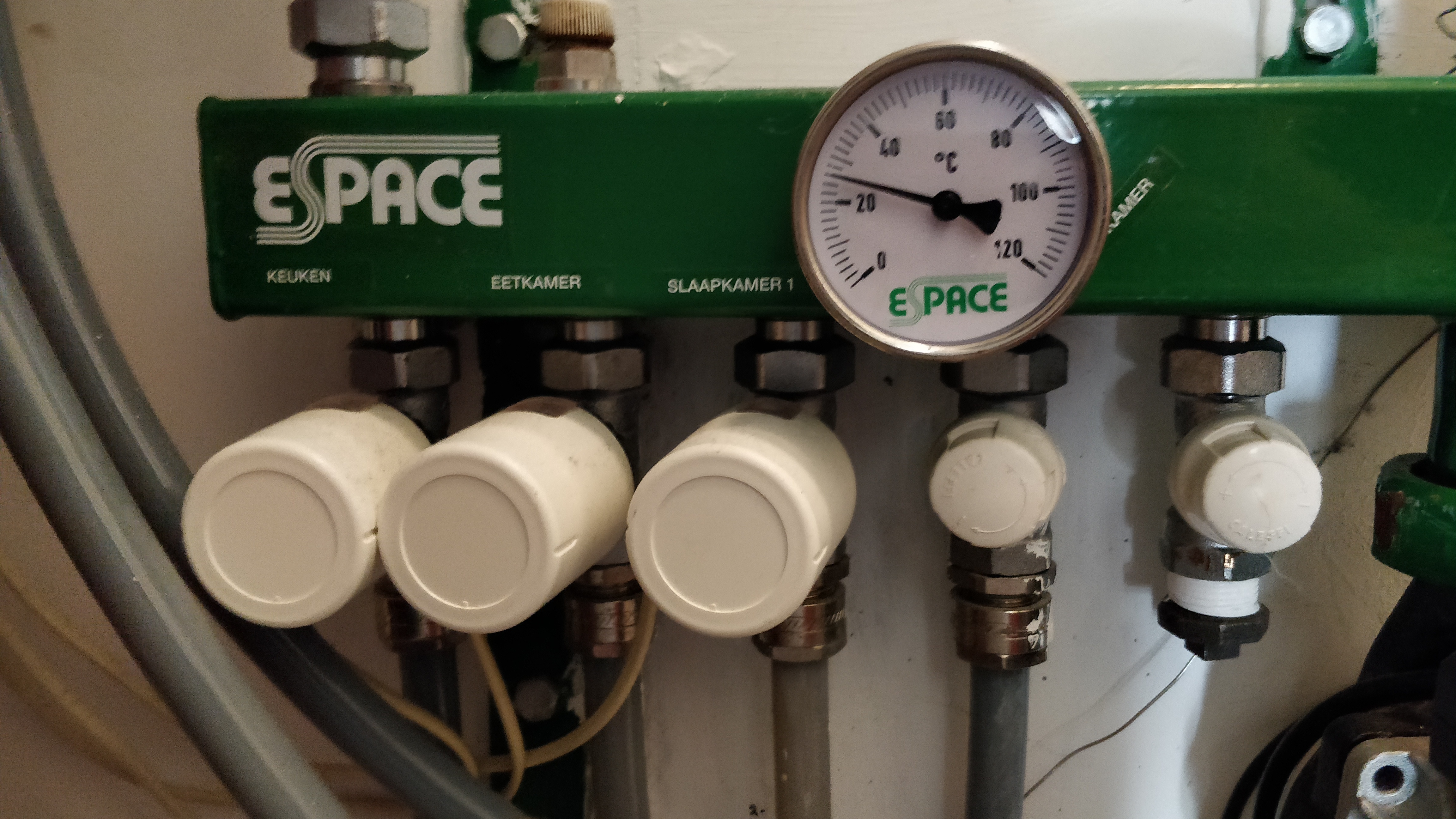 De vraag is natuurlijk of mijn vloerverwarmingsinstallatie daarvoor geschikt is. Onderstaande afbeeldingen tonen deze installatie. Op de derde afbeelding is goed te zien dat de eerste drie 'knoppen' bestuurt worden door de thermostaten. Knop 1 en 2 worden gestuurd door de thermostaat in de woonkamer, knop 3 wordt gestuurd door de thermostaat in de slaapkamer. Het apparaatje op de vierde afbeelding is volgens mij verbonden met de thermostaten zelf.