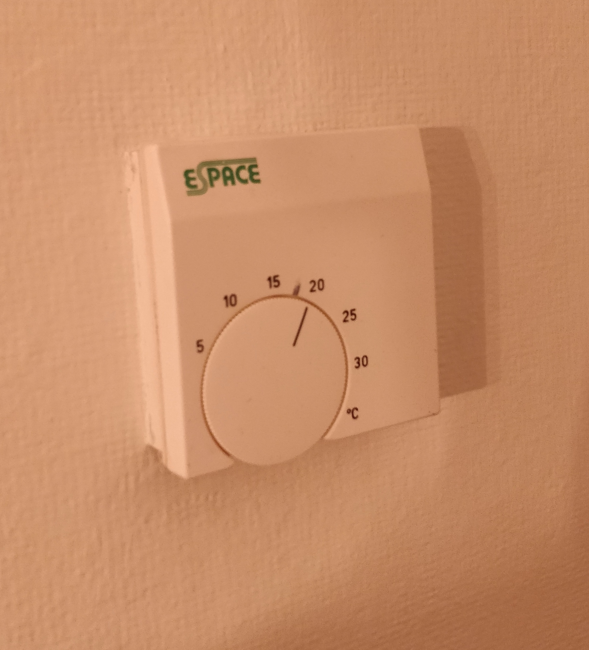 De twee 'hoofdruimtes', namelijk woonkamer + keuken en de slaapkamer hebben beide een eigen thermostaat (zie onderstaande afbeelding).