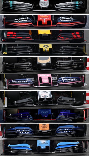 De verschillen in voorvleugels hadden we hiervoor ook al wel, bijvoorbeeld bij de vorige generatie vleugels. De verschillen waren wel iets subtieler, maar nog steeds waren er teams die meer downforce uit de voorvleugel wilden halen (bv Mercedes) en teams die de voorvleugel gebruikten om vooral de luchtstroom te conditioneren richting de rest (bargeboards, tea tray/splitter, vloer, bovenkant diffuser). Dit zag je bijvoorbeeld bij Red Bull. Dit hangt samen met andere keuzes van het design bijvoorbeeld hoeveel rake het chassis heeft.