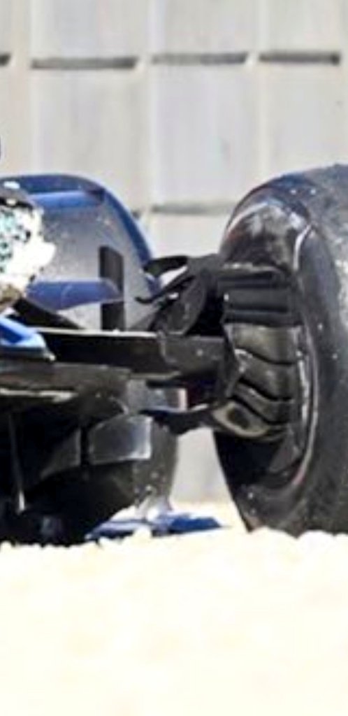 En ja, hij laat hem zo te zien zelf het gras op lopen. Niet handig...Duidelijk ook te zien dat de achtervleugel niet afbreekt o.i.d. voor hij de barriers in gaat.