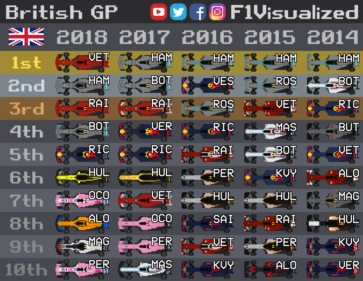 Mijn eerste reactie was 'Huh, Verstappen tweede in 2016?'. Maar er was toen inderdaad een race dat Verstappen een plekje had gewonnen ten opzichte van Rosberg. Dit omdat toen nog de regels waren dat het team de coureur niet mocht helpen en Mercedes Rosberg wel een aantal instellingen op het stuur had laten aanpassen. Daarvoor kreeg hij toen een time-penalty waardoor Verstappen inderdaad een plekje won. Zal dan dus Silverstone zijn geweest.